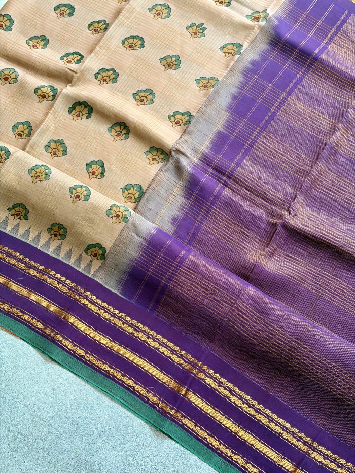 Cream Gadwal Silk with Purple Shot Blue Accents