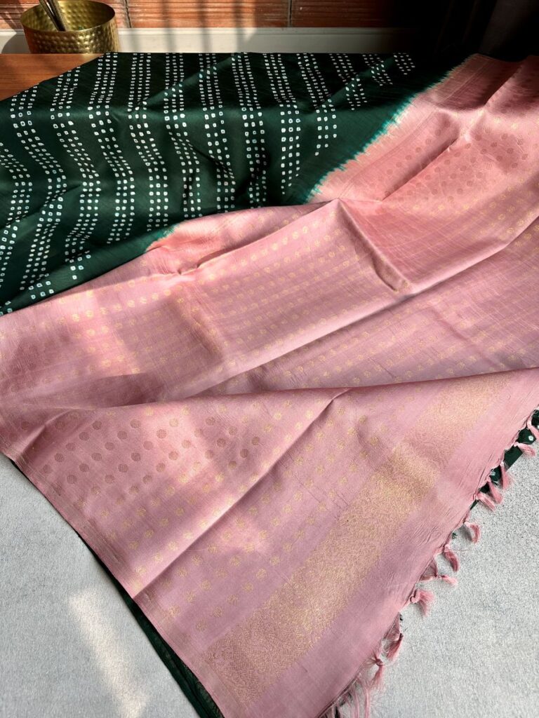 Dark Green with Pastel Pink Hand-knotted Bandhani on Kanchipuram Silk