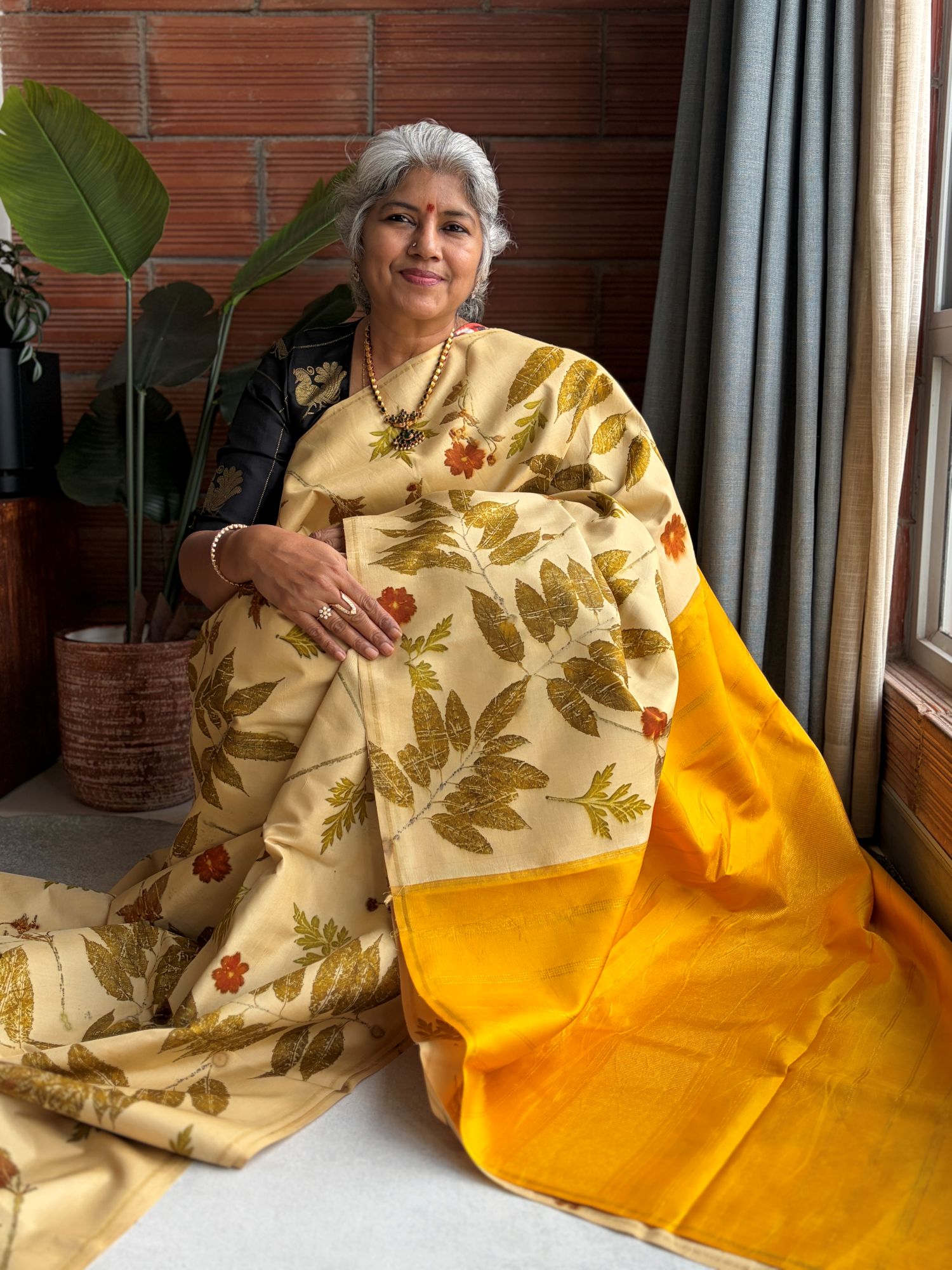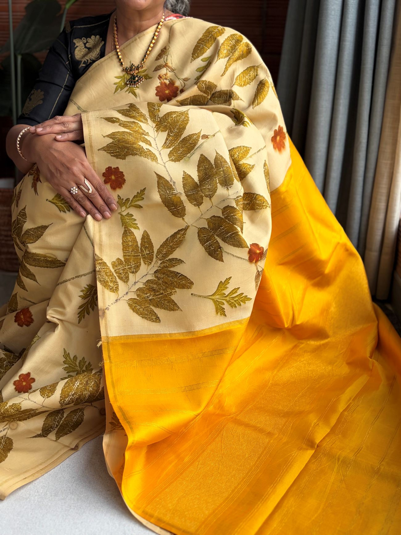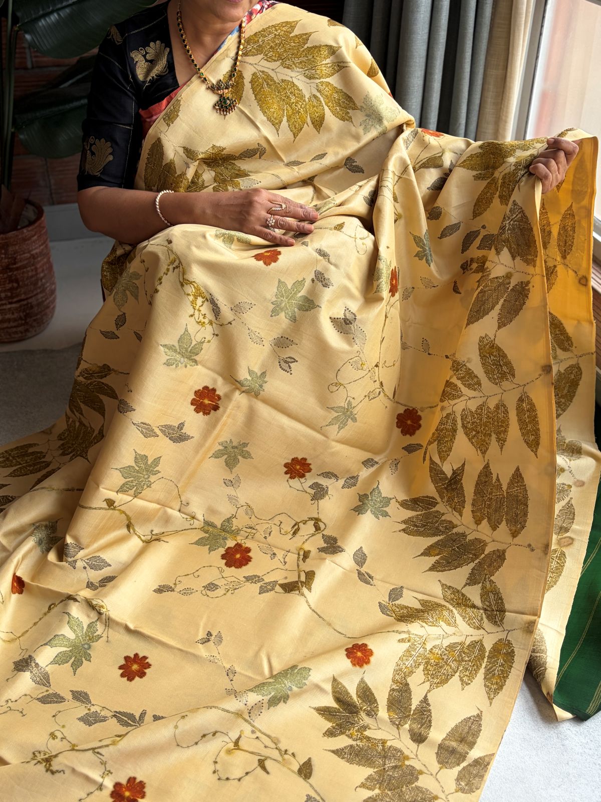 Cream & Mustard Eco-printed Kanchipuram Silk