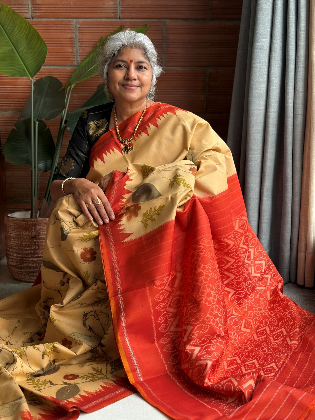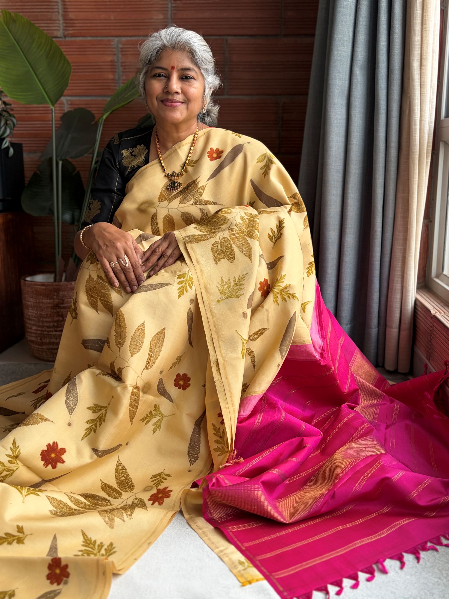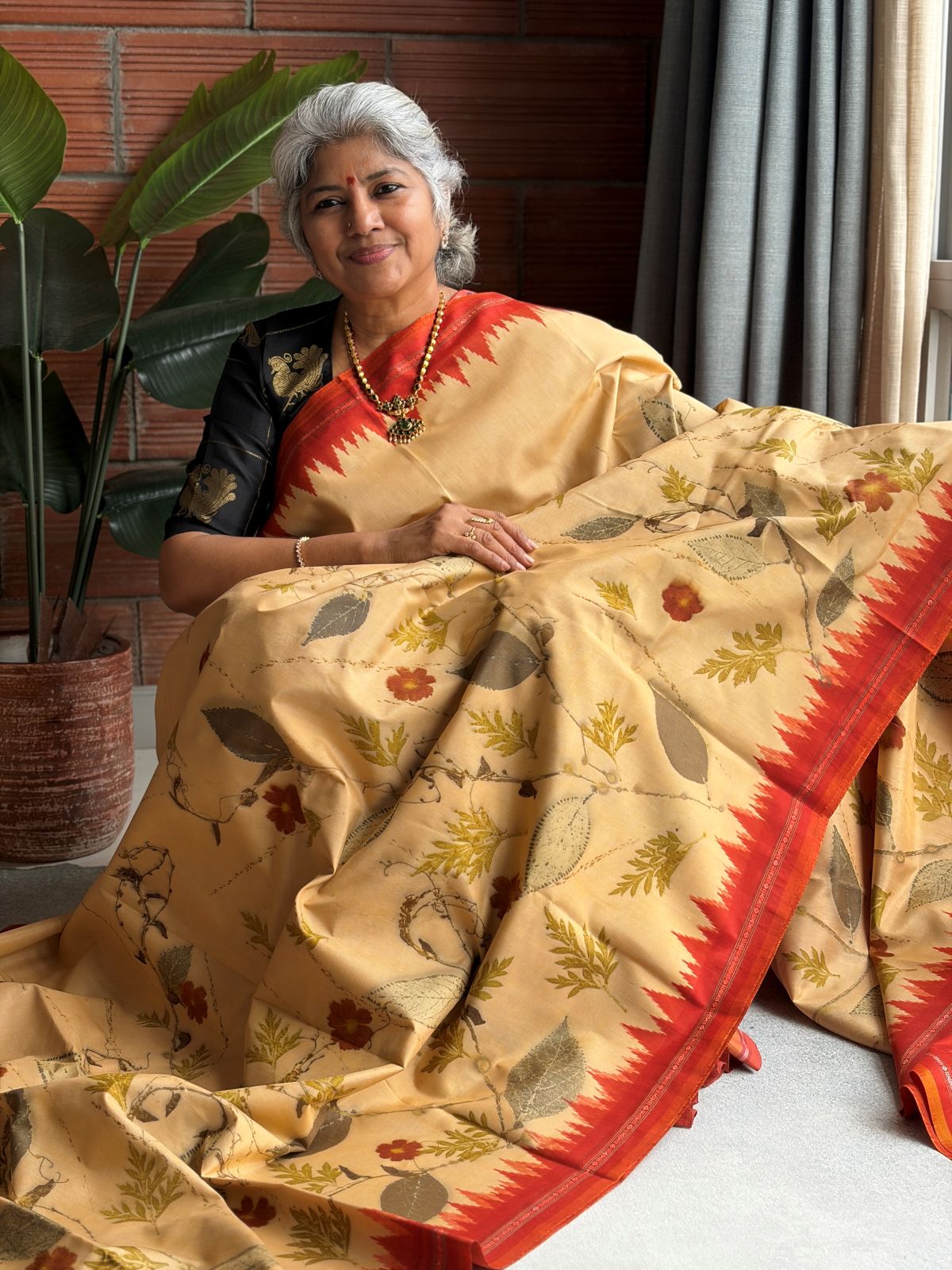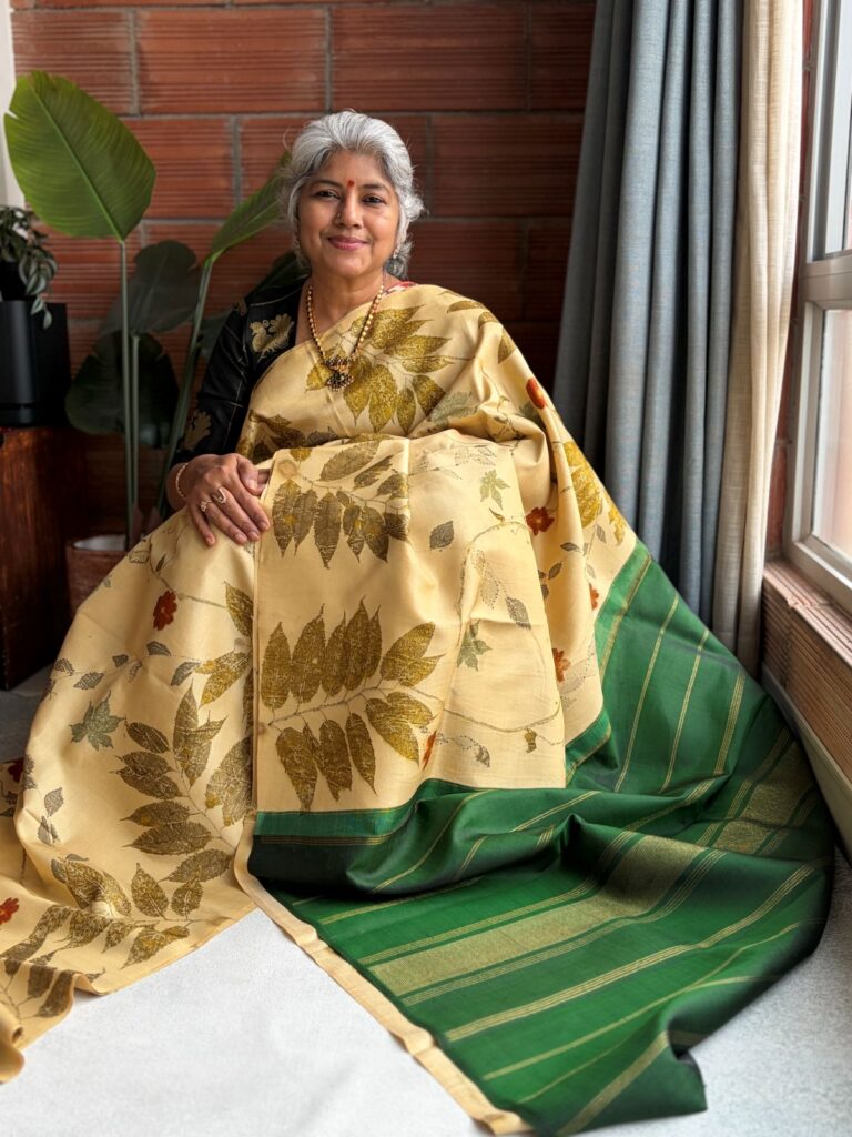 Cream & Mustard Eco-printed Kanchipuram Silk