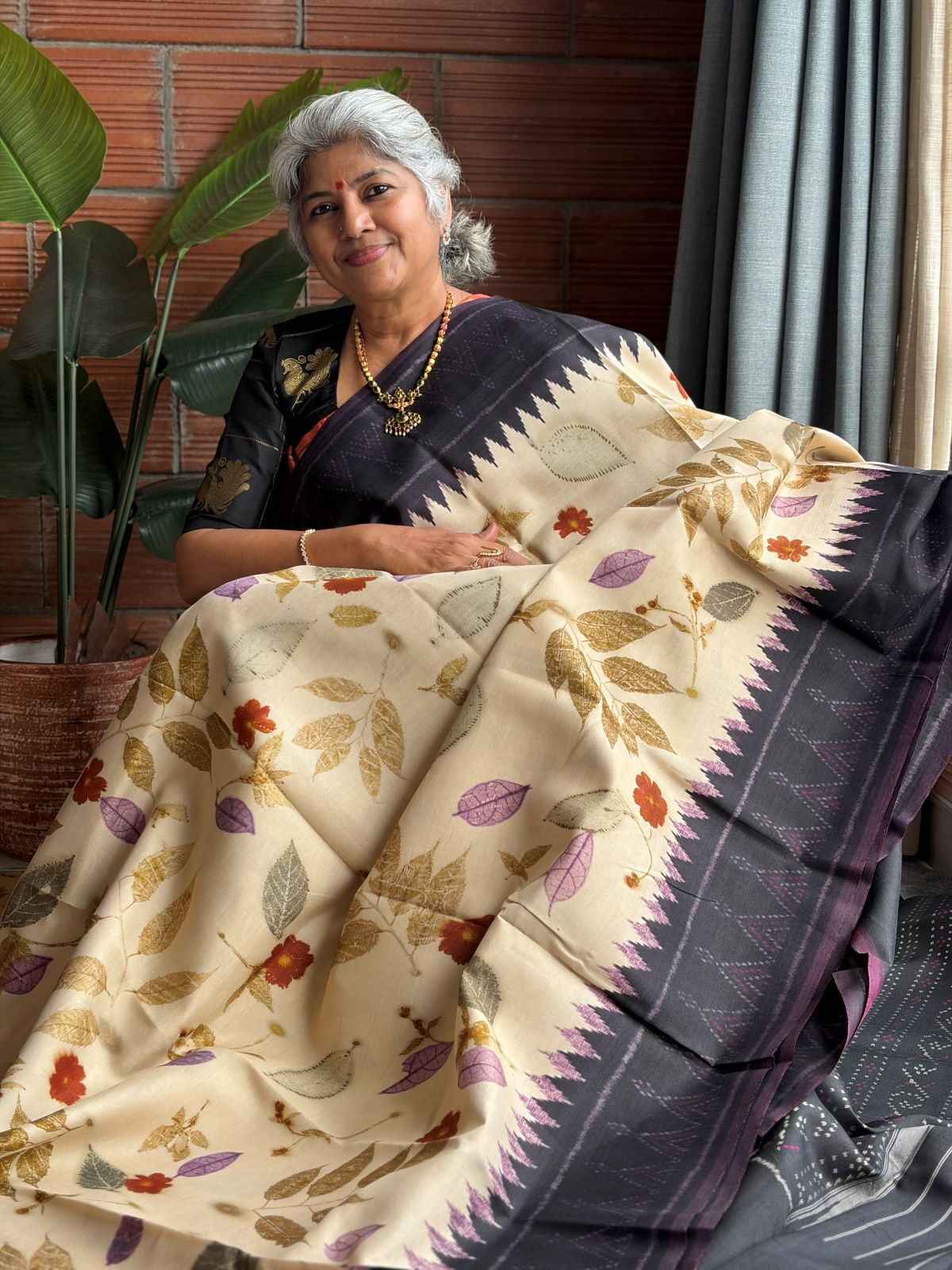 Cream & Brown Eco-printed Kanchipuram Silk