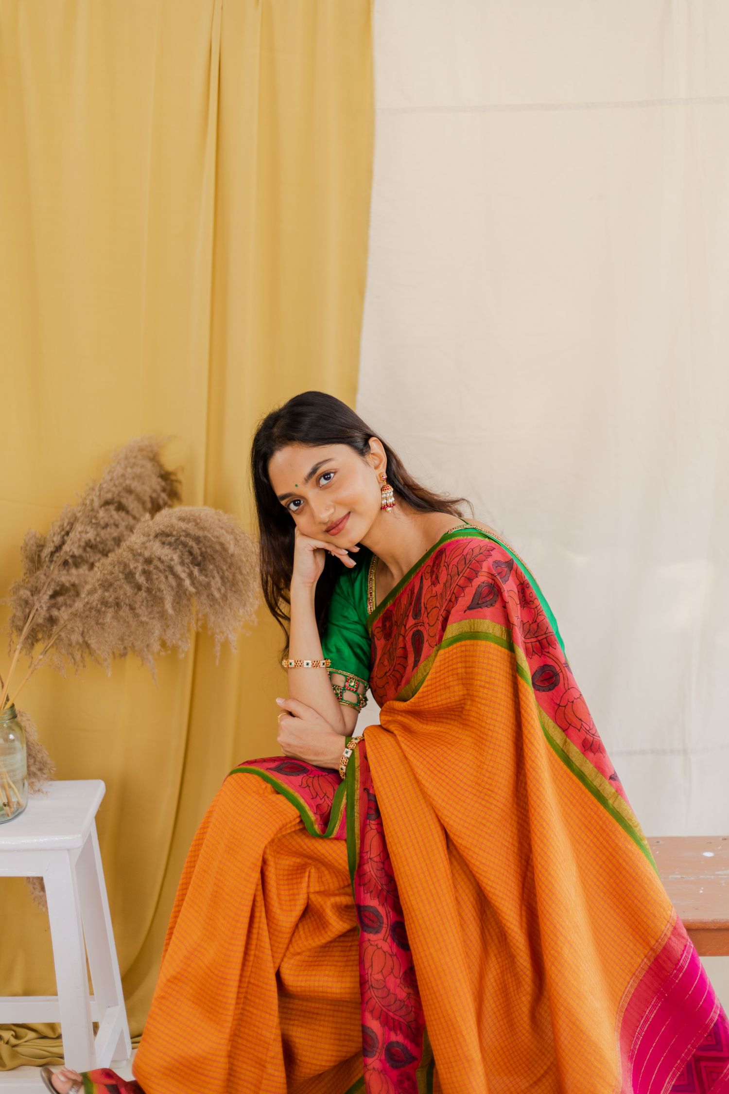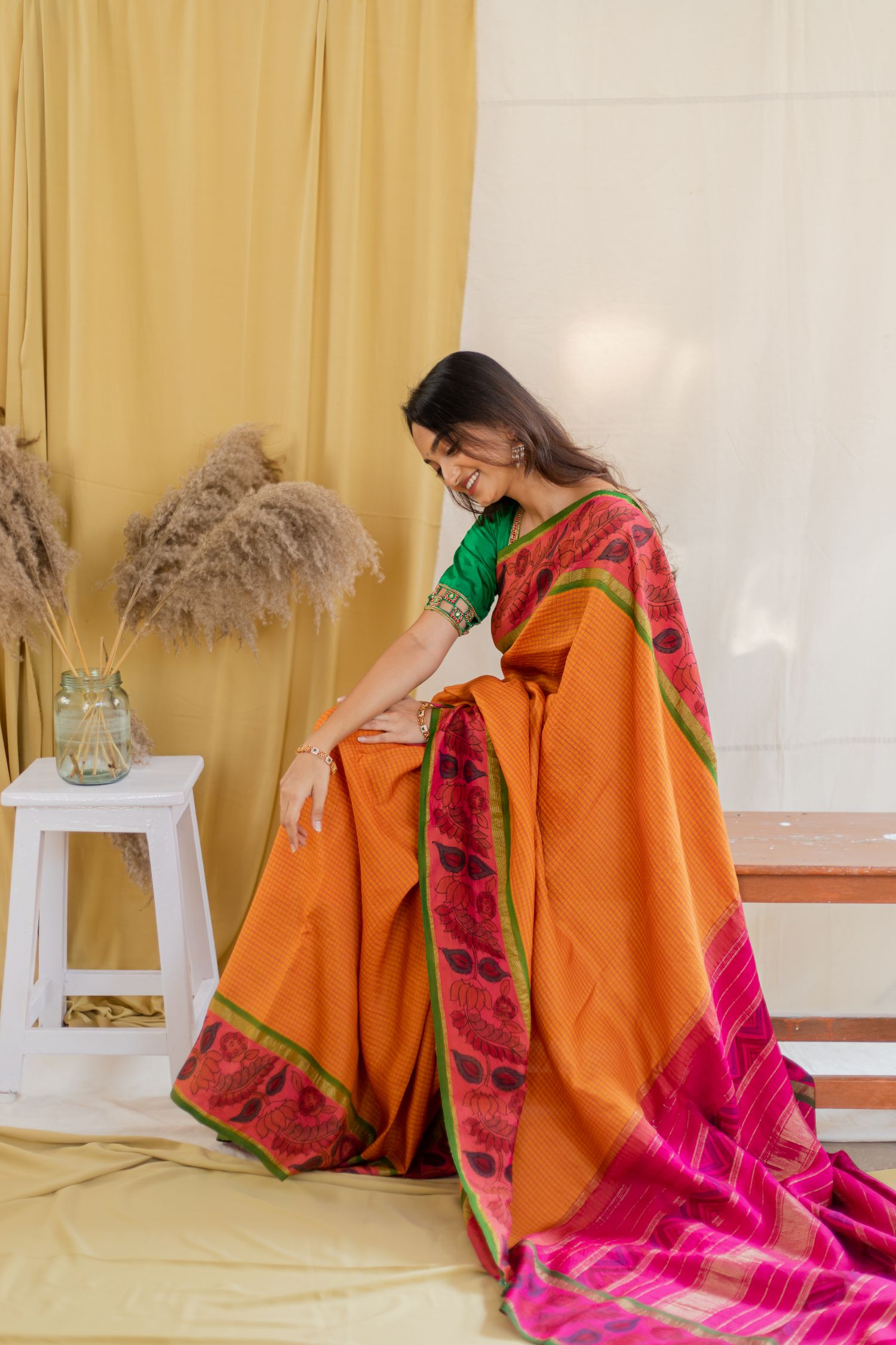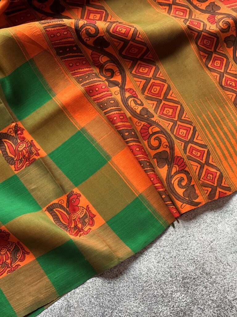 Orange & Green Checked Kanchipuram Silk with Hand-Drawn Kalamkari (Zero Zari)