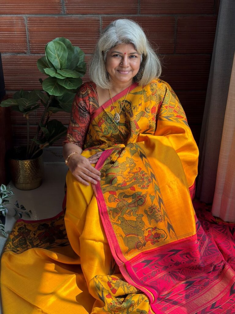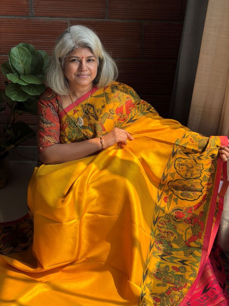 Hand-painted Kalamkari on pure Kanchipuram silk saree – Sunshine Reversible saree