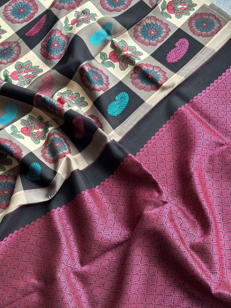Kattam Kanchipuram Silk with Hand-Drawn Kalamkari Floral & Paisley Motifs