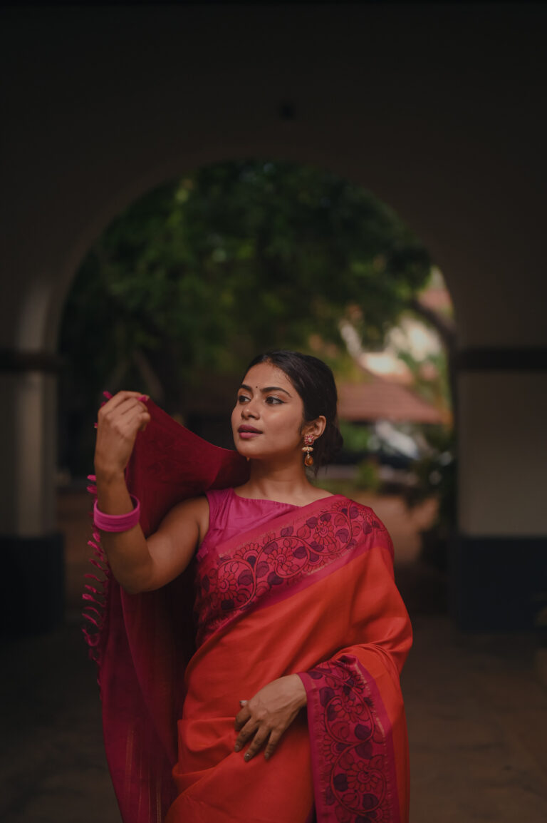Pink & Orange – Half and Half Hand-Drawn Kalamkari on Kanchipuram Silk
