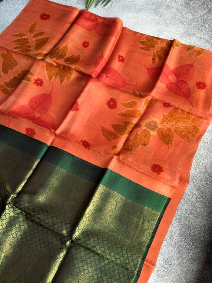 Vivid Peach Eco-Printed Organza Silk with Kanchi Pallu
