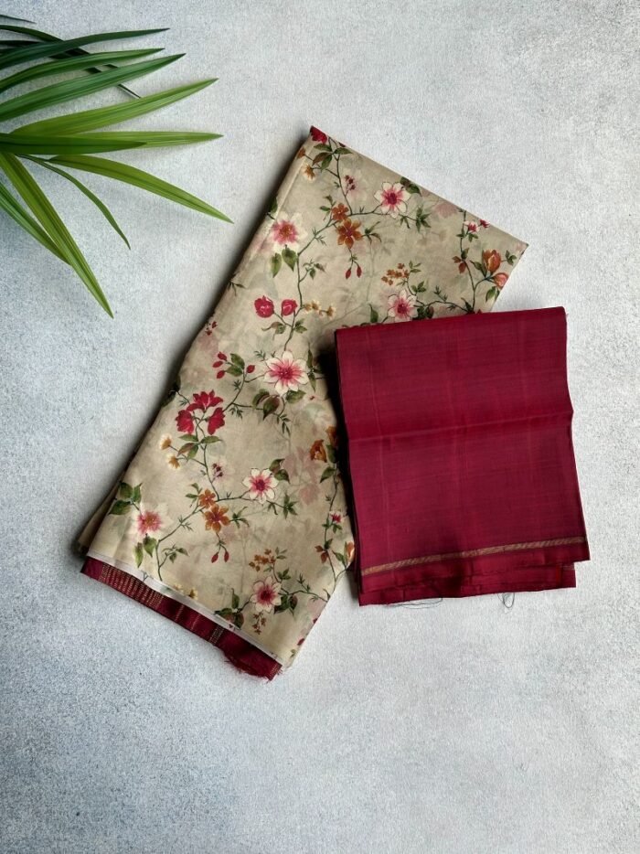 Cream-Grey Floral with Maroon Seer Zari Pallu on Organza Silk