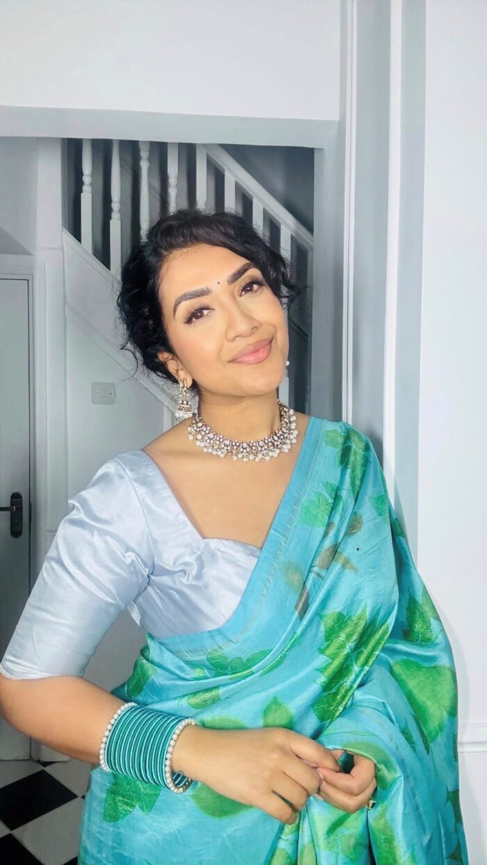 Nira – Aqua blue and grey Eco-Printed on pure zari Kanchipuram silk