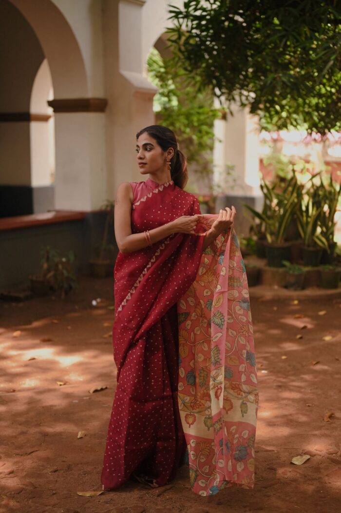 THOGAI- Maroon Bandhani Organza Silk Saree with Kalamkari Pallu