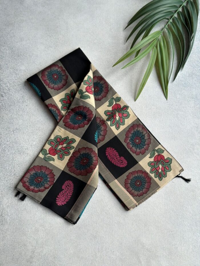 Kattam Kanchipuram Silk with Hand-Drawn Kalamkari Floral & Paisley Motifs