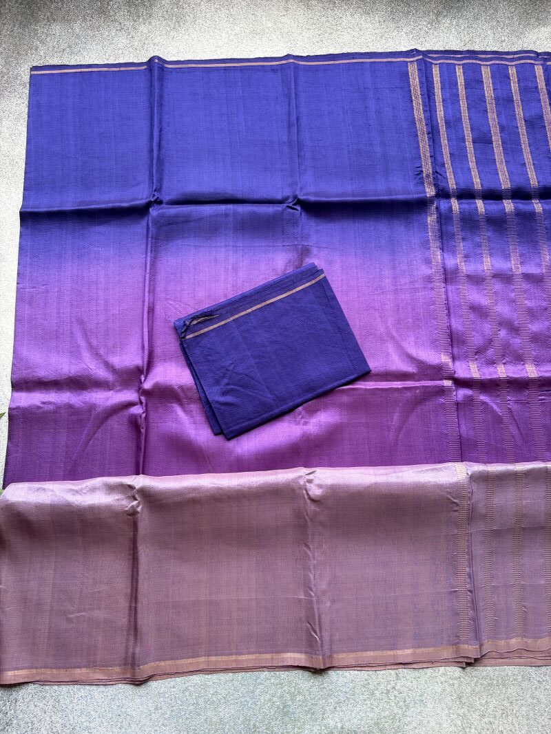 Like twilight slowly deepening into night, this shaded Kanchipuram silk flows from blue into deep purple shot with blue. The body carries a beautiful metallic sheen that shifts gently with light, adding depth and drama without overpowering the weave. Finished with a classic seer zari pallu and a contrast blouse, this saree feels contemporary yet rooted — perfect for evenings that call for understated glamour and effortless elegance.