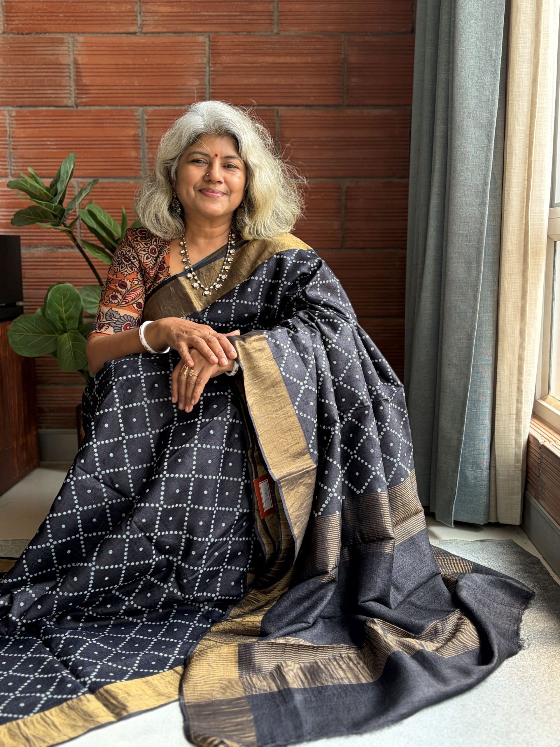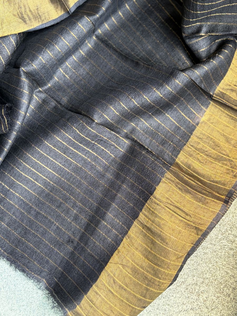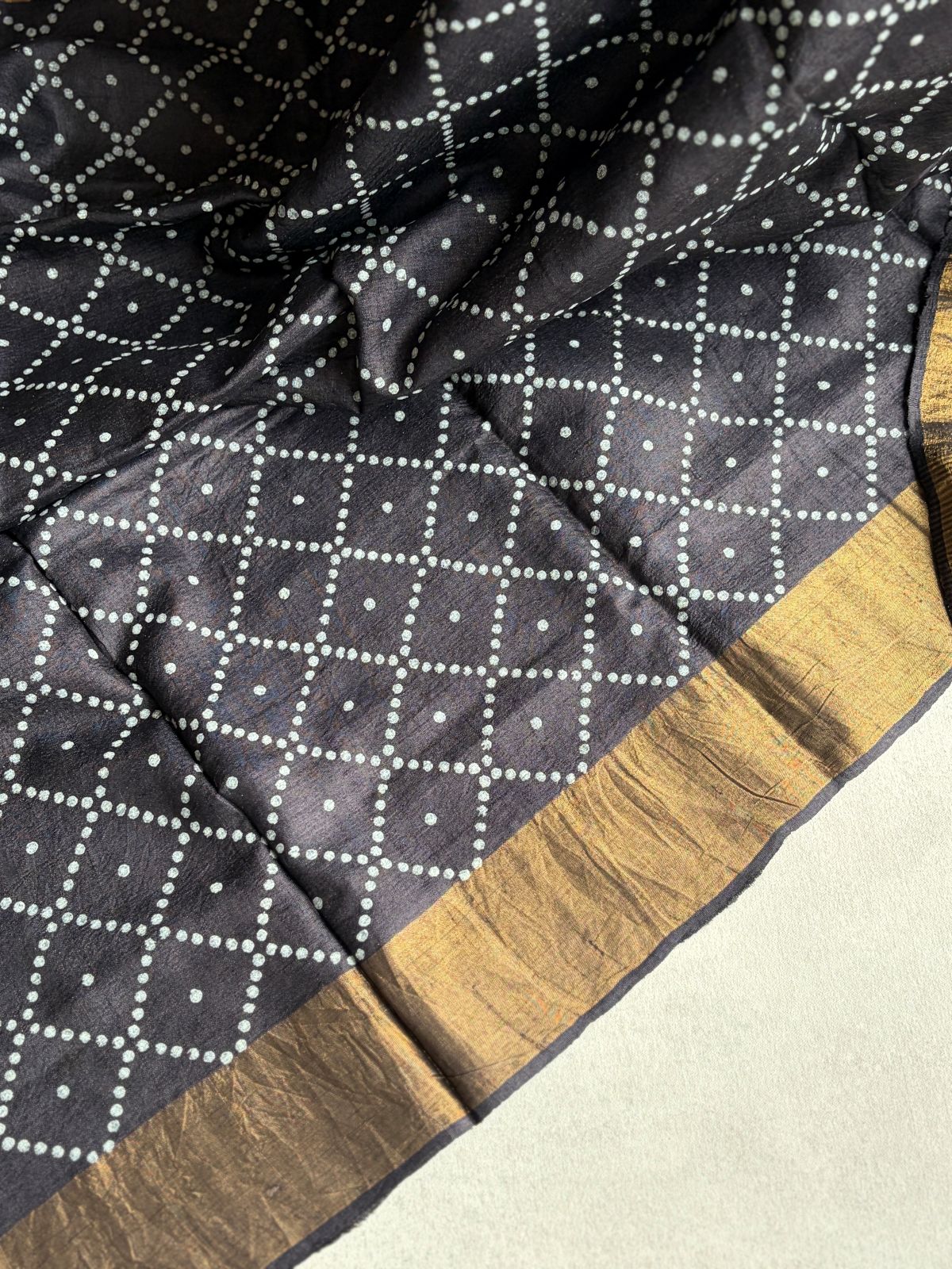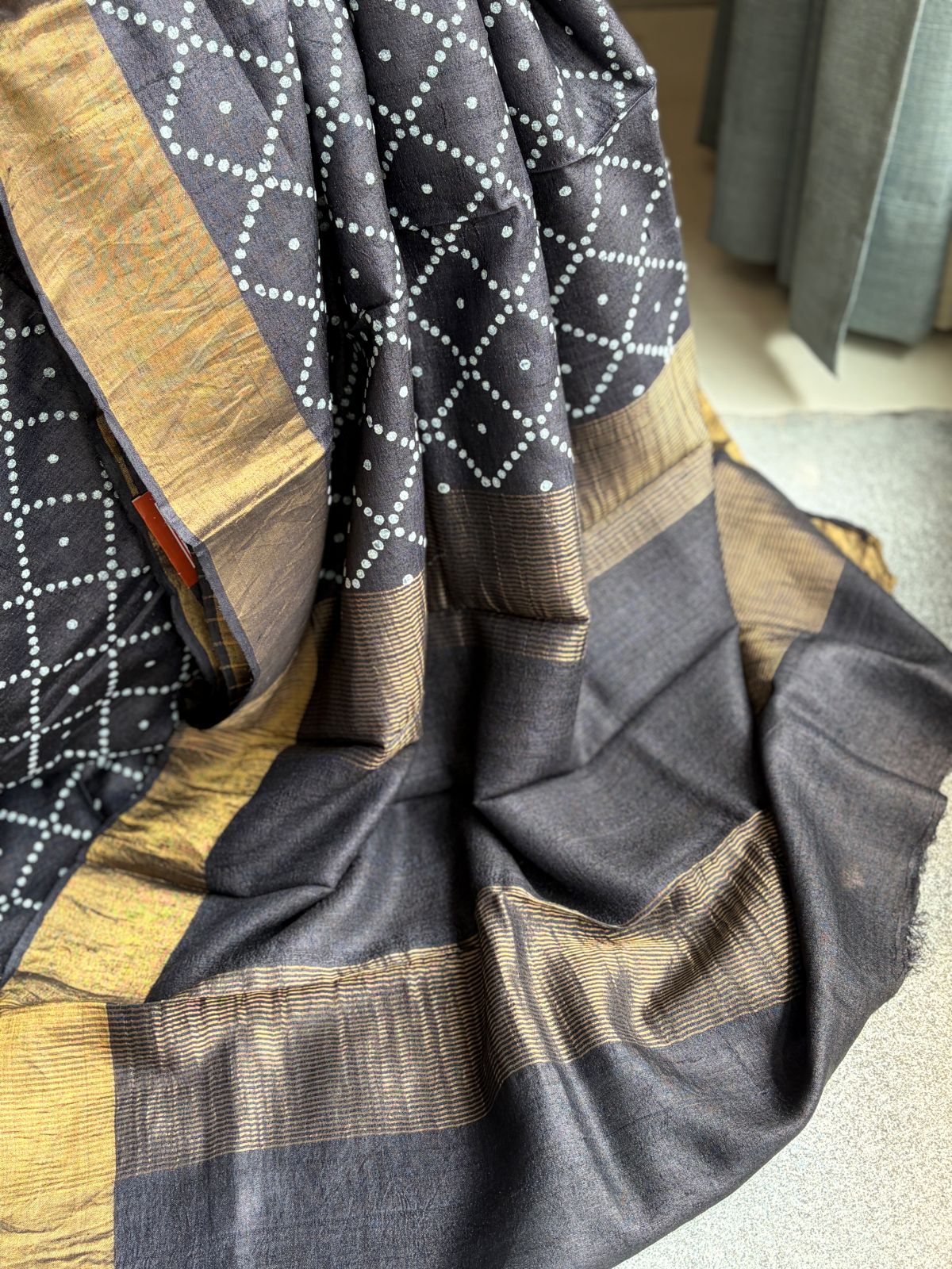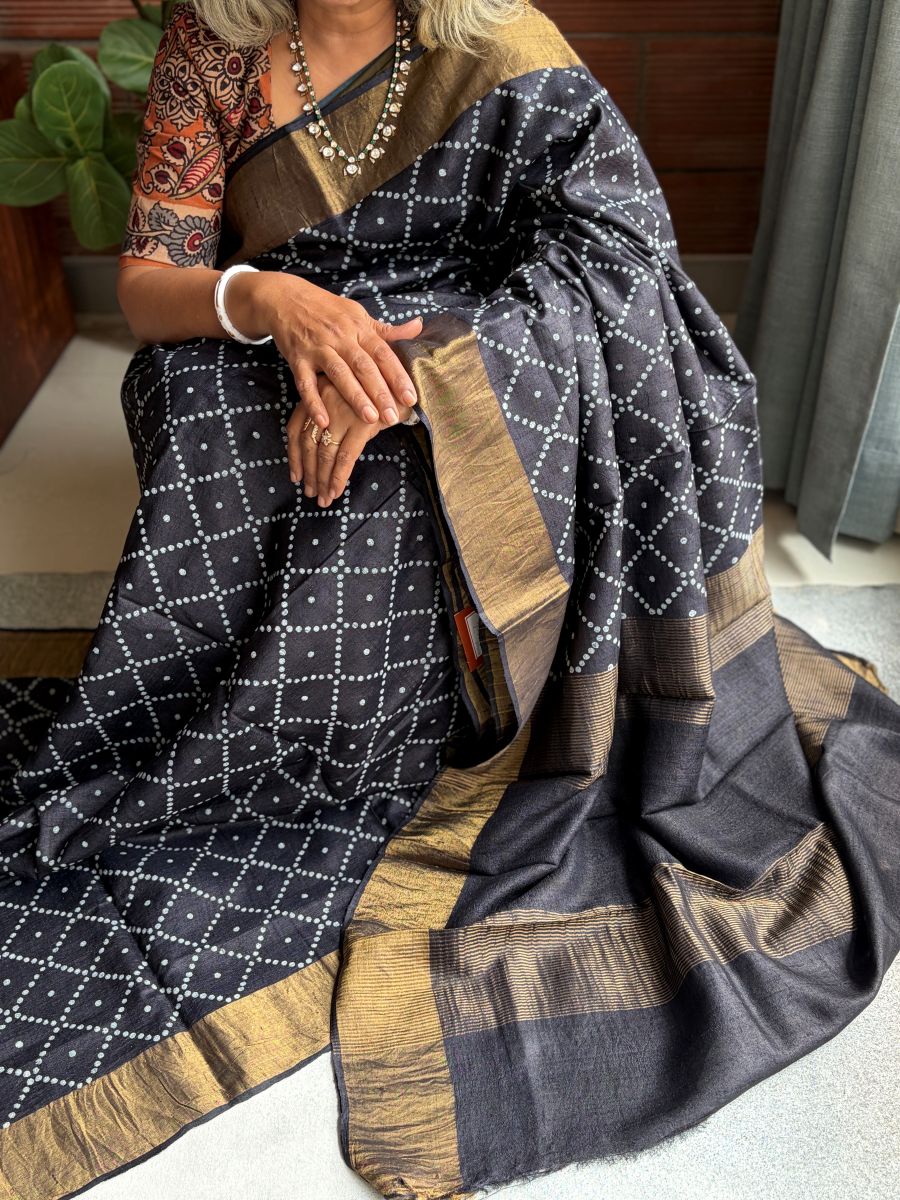 Black Tusser silk saree with Bandhani prints, zari border, rich zari pallu and running blouse with zari border for elegant festive wear.