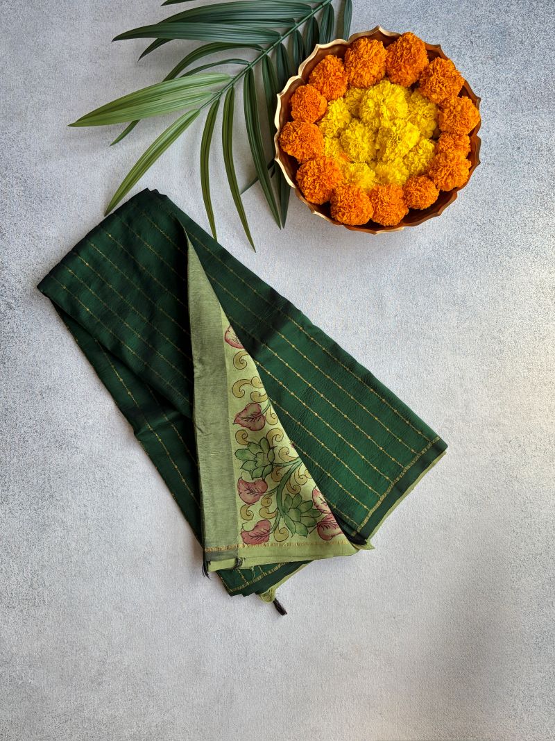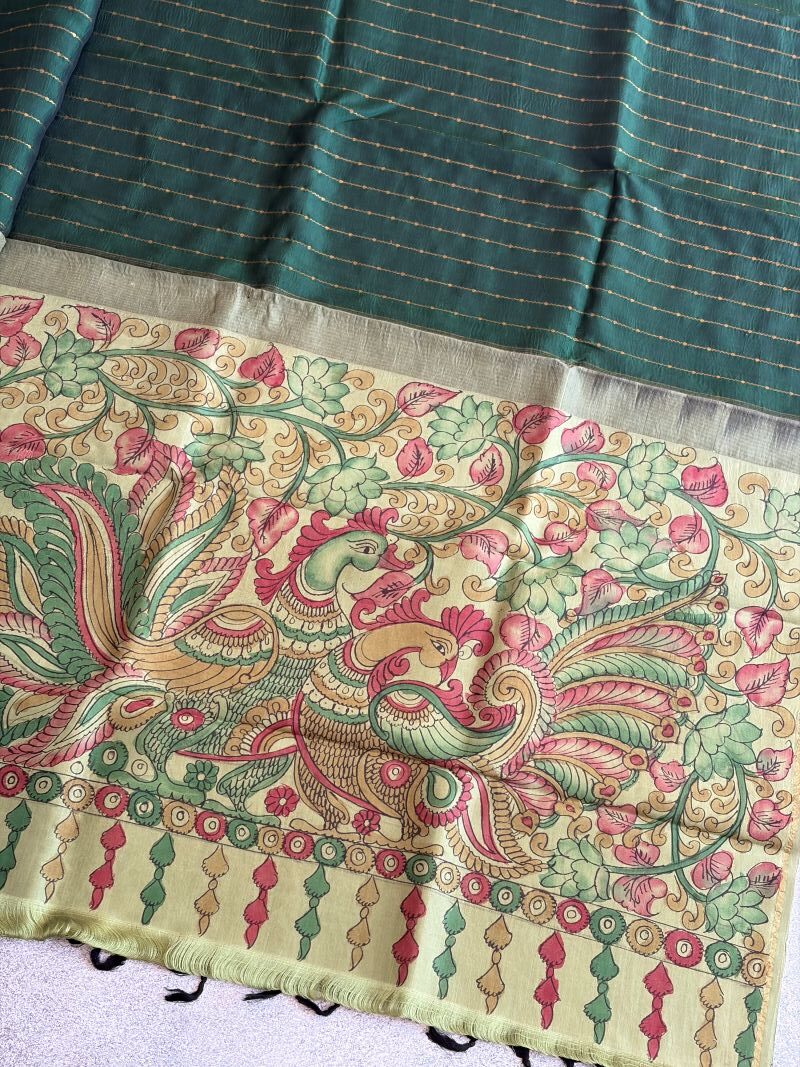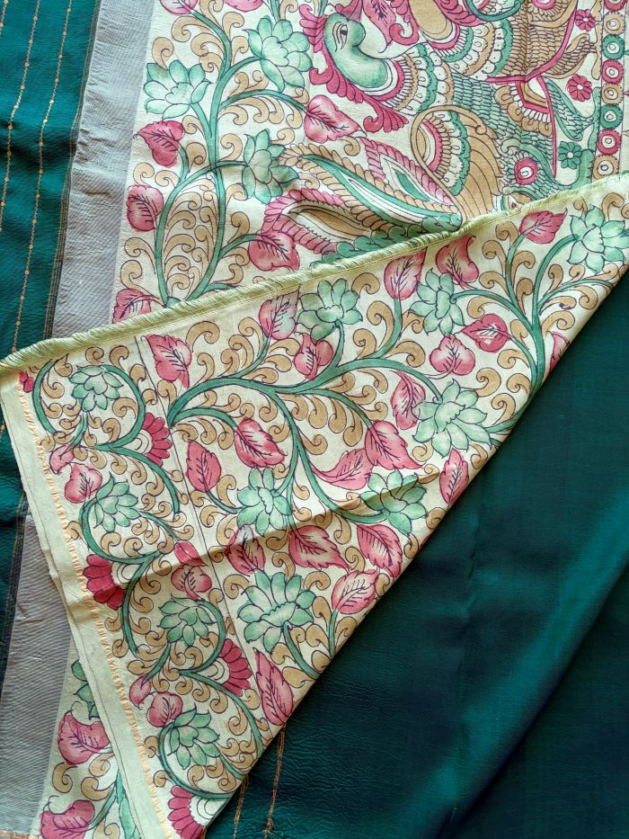 Dark green Kanchipuram silk with hand-drawn Kalamkari peacock pallu and blouse, enriched by traditional weaving crafted for graceful Pongal celebrations.
