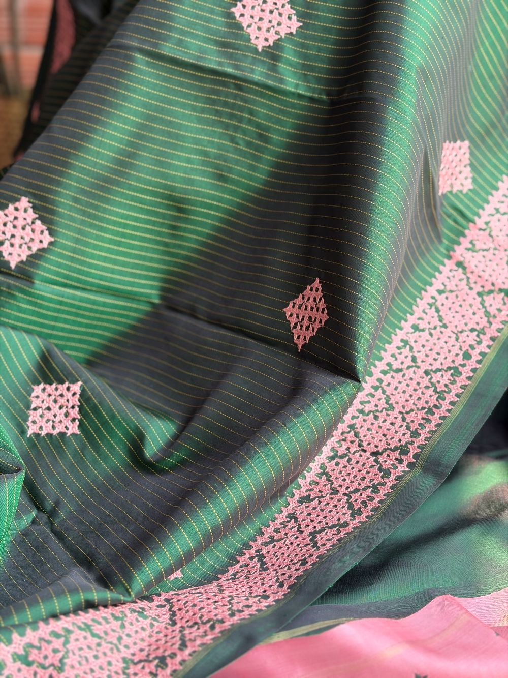Thread-striped pure Zari Kanchipuram silk saree in dark green with pastel pink Kutch hand-embroidered butties and borders, seer Zari pallu and a matching Kutch-embroidered blouse.