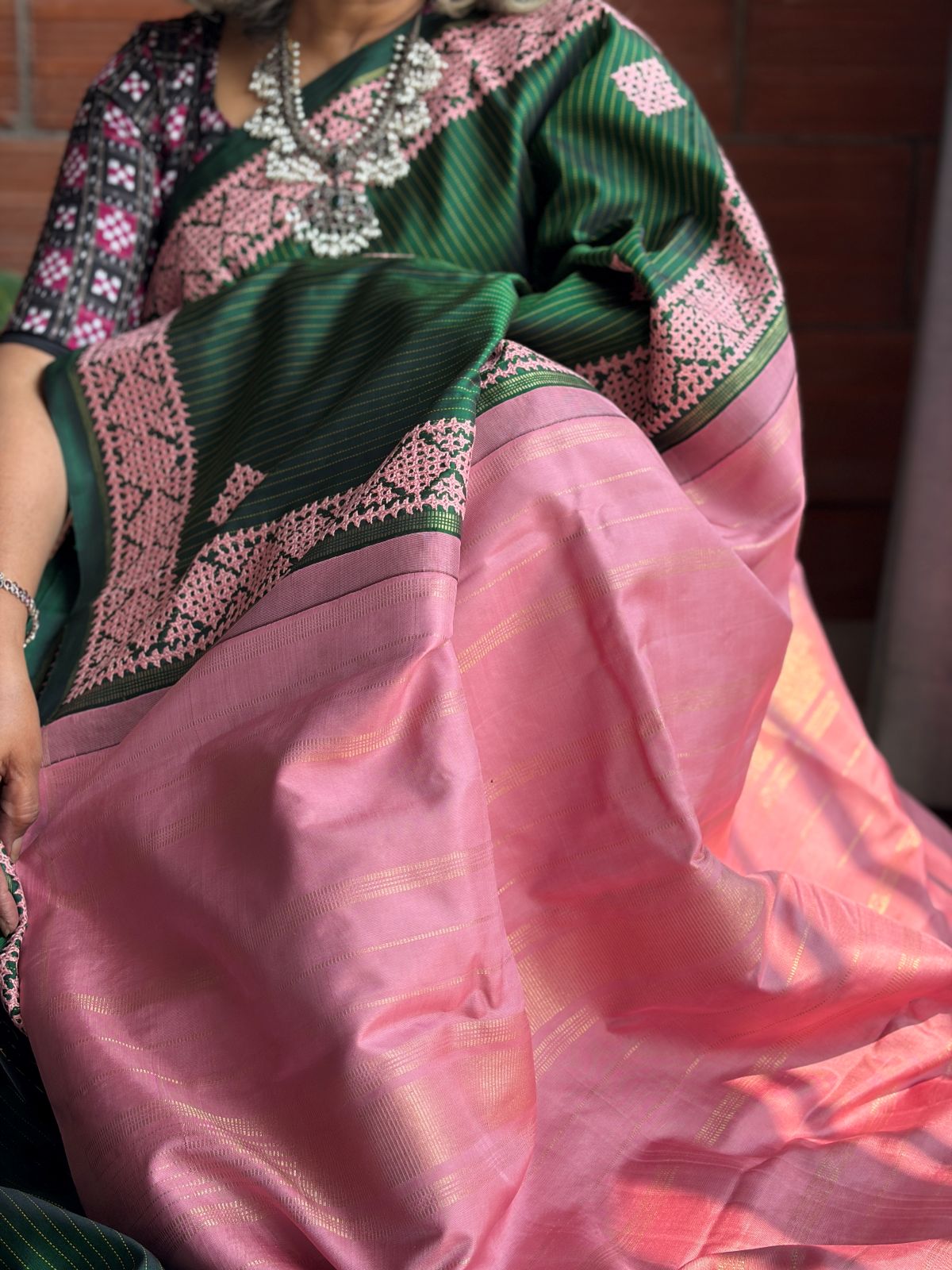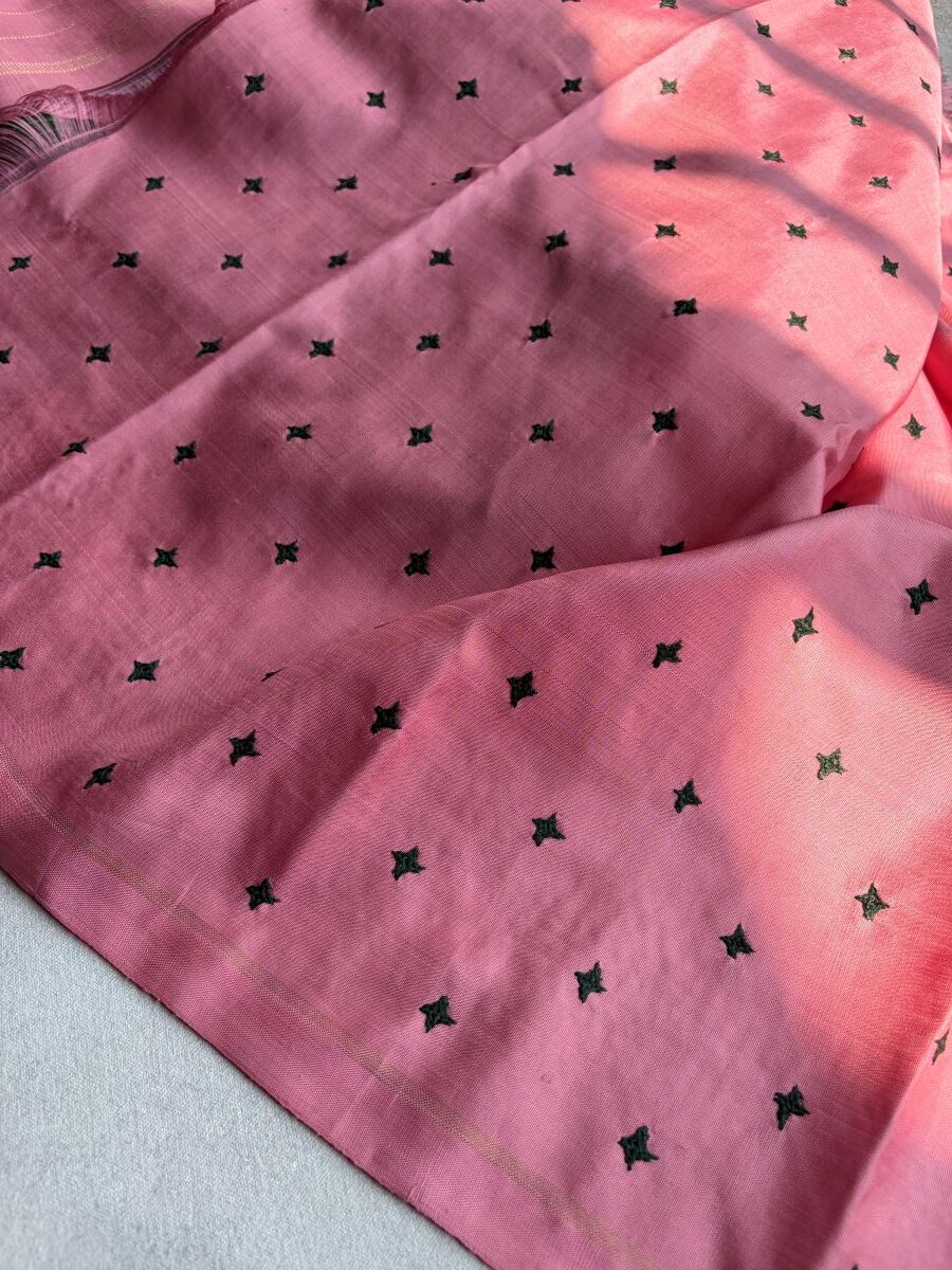 Bold where it needs to be. Tender where you least expect it. The Ampal in Dark Green is a study in the most beautiful of contrasts. The body is a striking dark green pure Zari Kanchipuram silk, woven with fine thread stripes that give it texture and depth. Scattered across it are Kutch hand-embroidered butties in the softest pastel pink — a pairing so unexpected it feels inevitable. The borders carry the same delicate Kutch needlework, tracing the edges of the drape in blush. Then comes the seer Zari pallu in pastel pink — a luminous, almost dreamy counterpoint to the richness of the green. The blouse, woven to match the pallu, carries a subtle whisper of Kutch embroidery along its seams. To wear this saree is to understand that strength and softness were never opposites.
