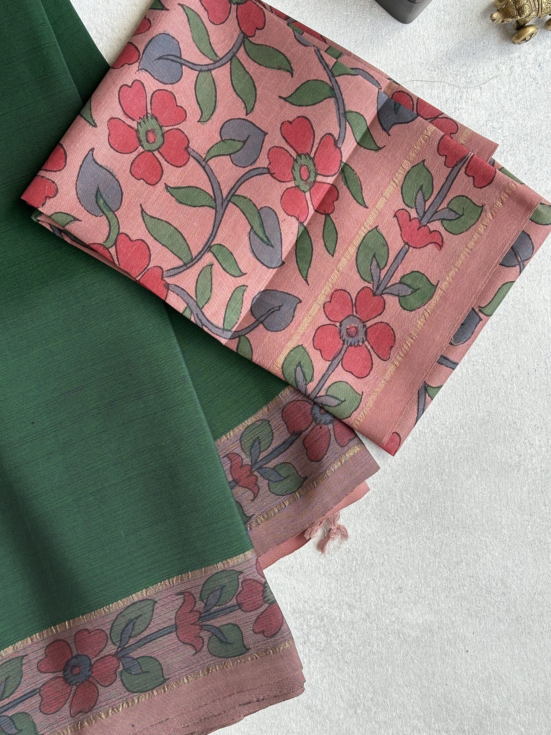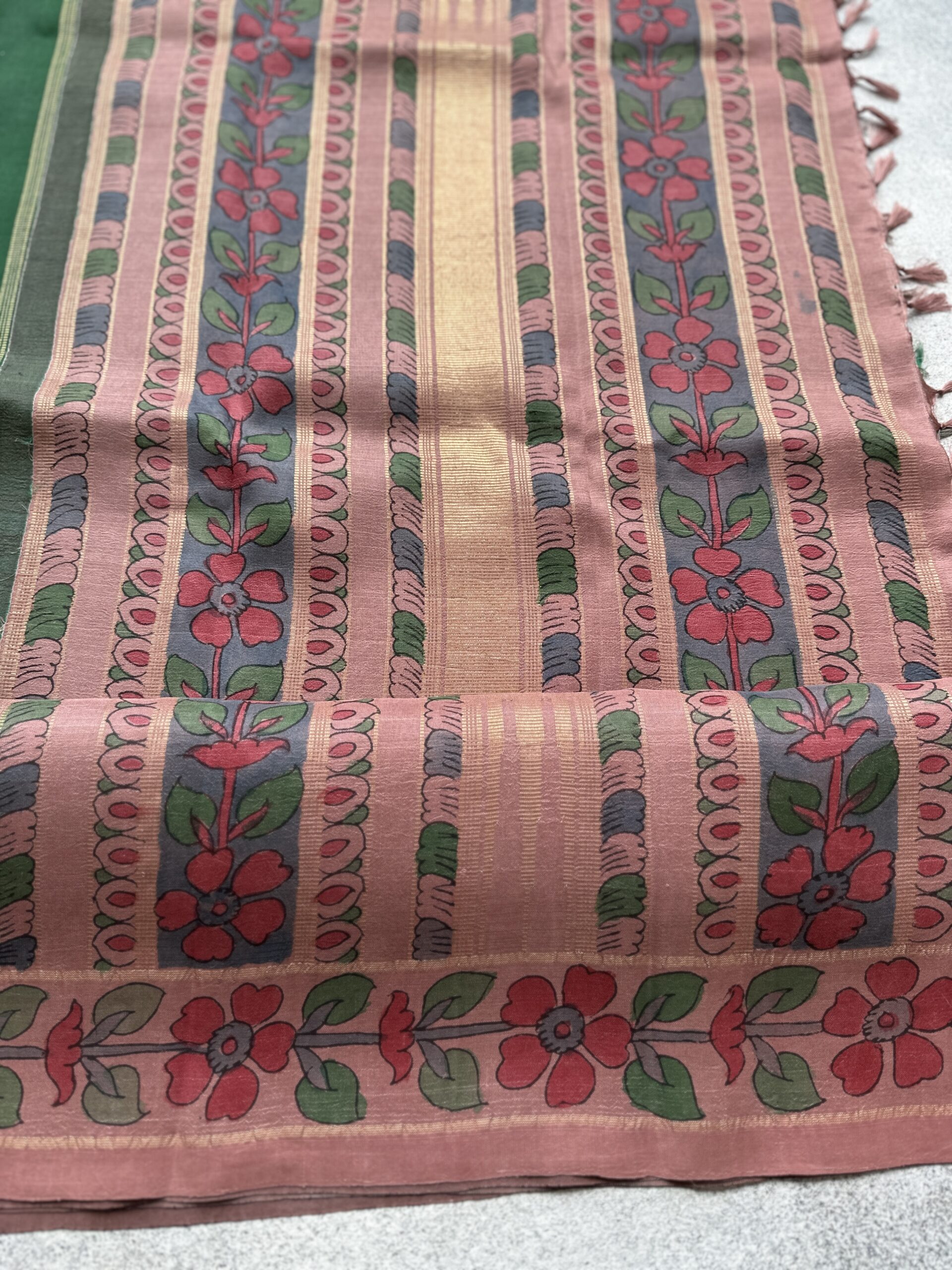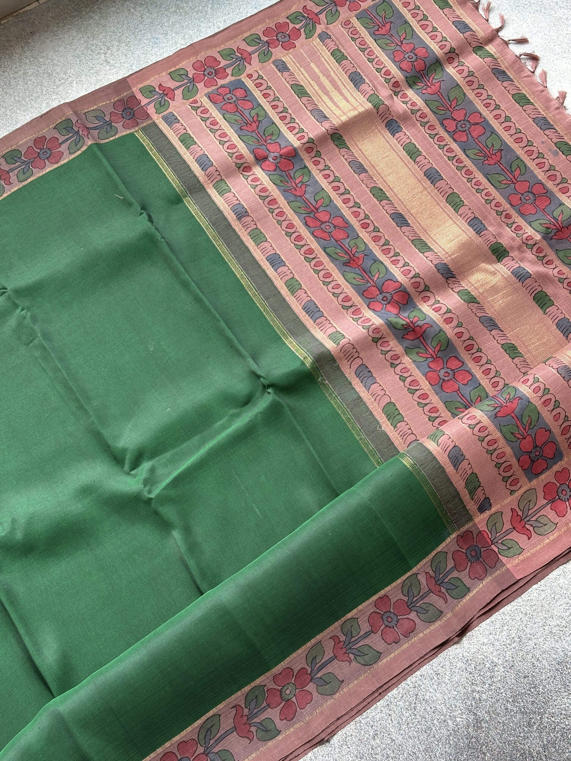 Deep green Kanjivaram with subtle Kalamkari and dusky pink — soft, artistic, and timelessly graceful.