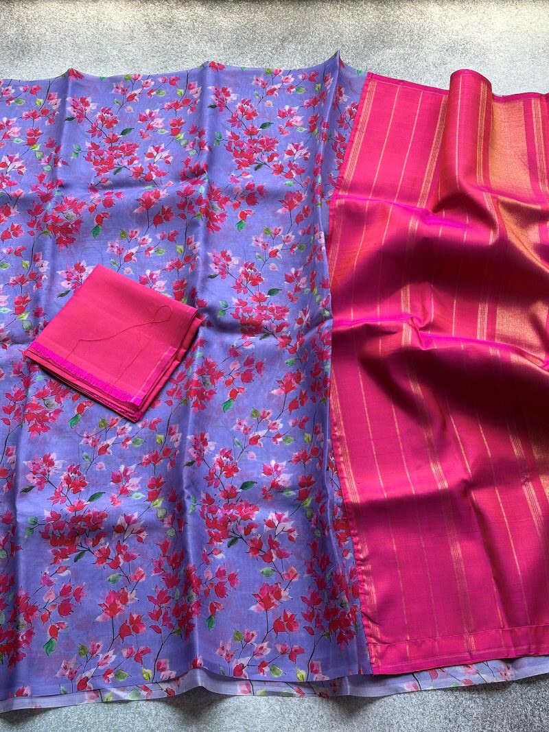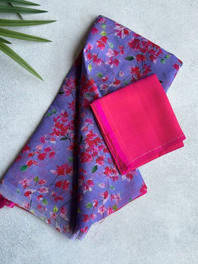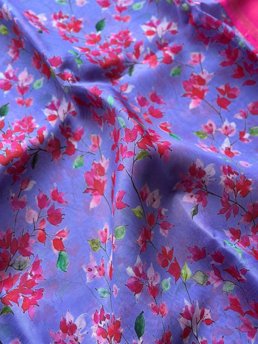 Deep lavender organza kissed with bougainvillea blooms, Vibrant, elegant, unforgettable.