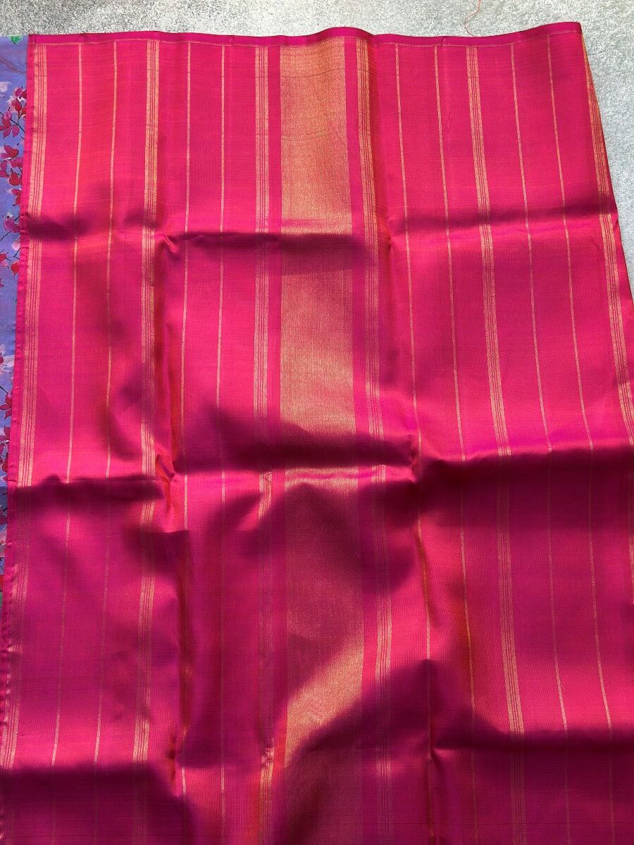 Blouse: Peach-Pink Kanchipuram seer zari blouse.