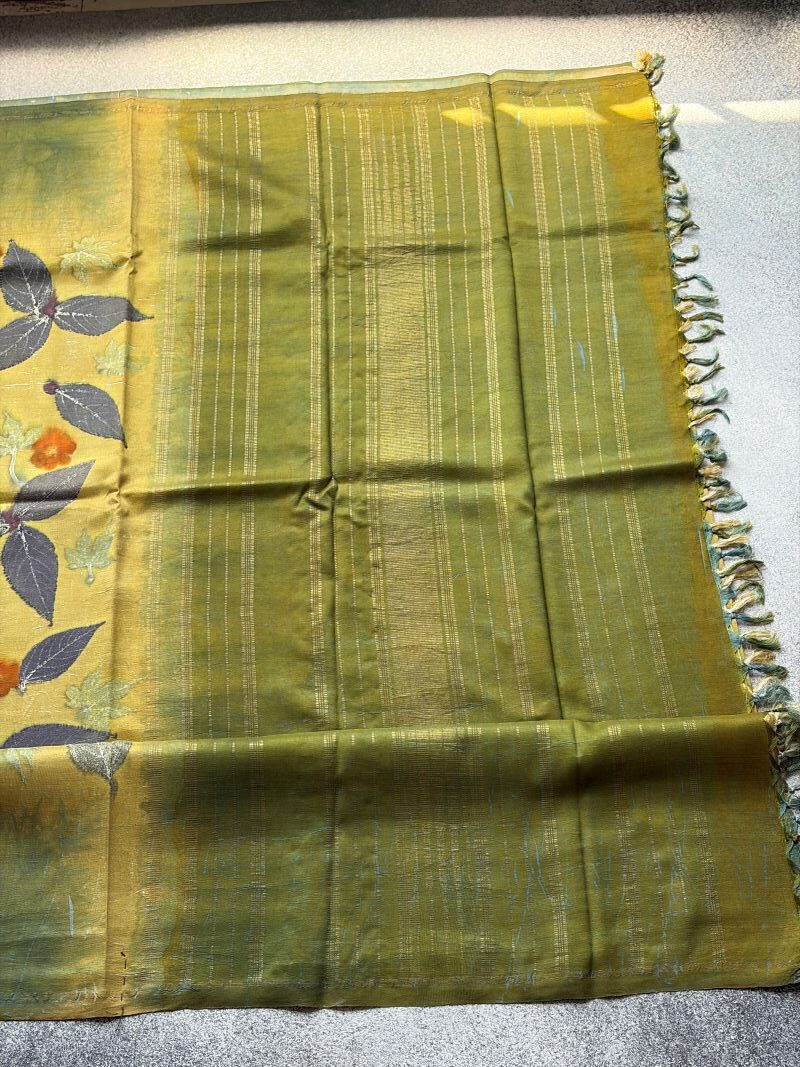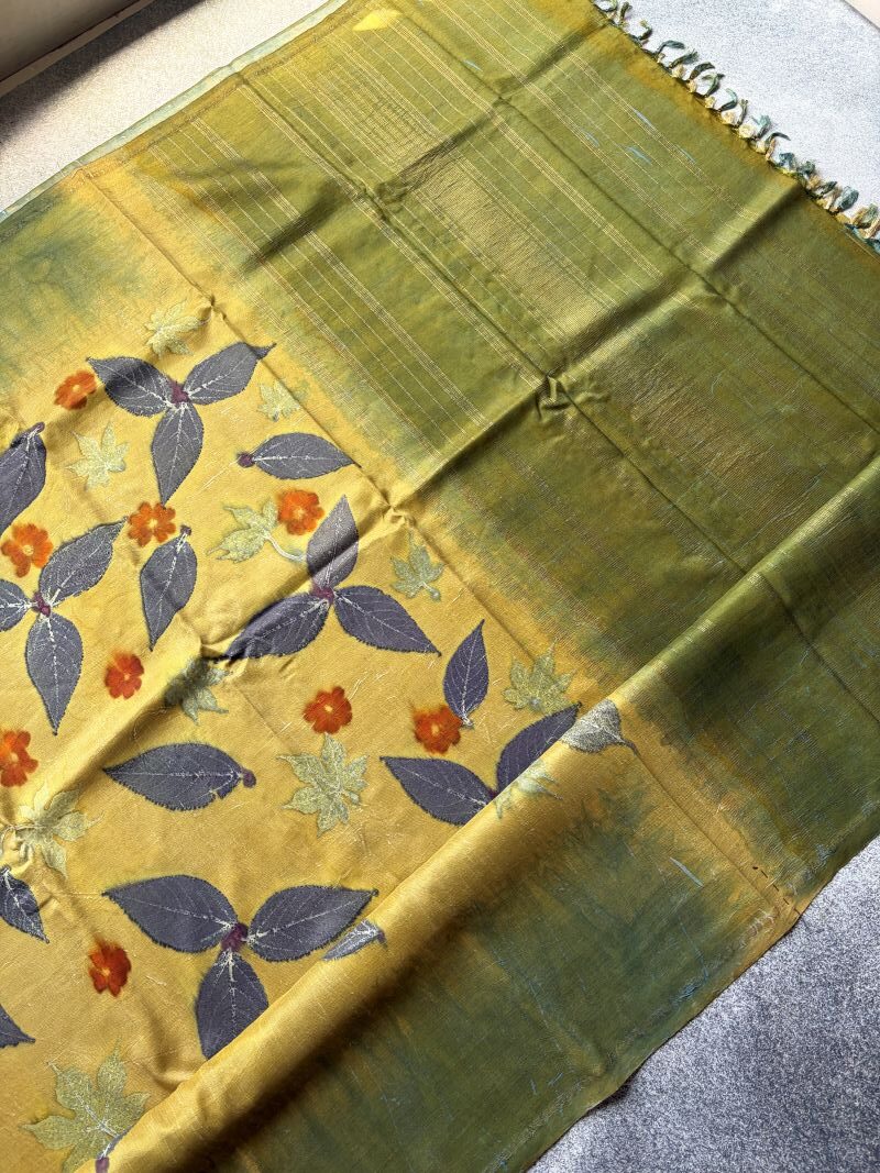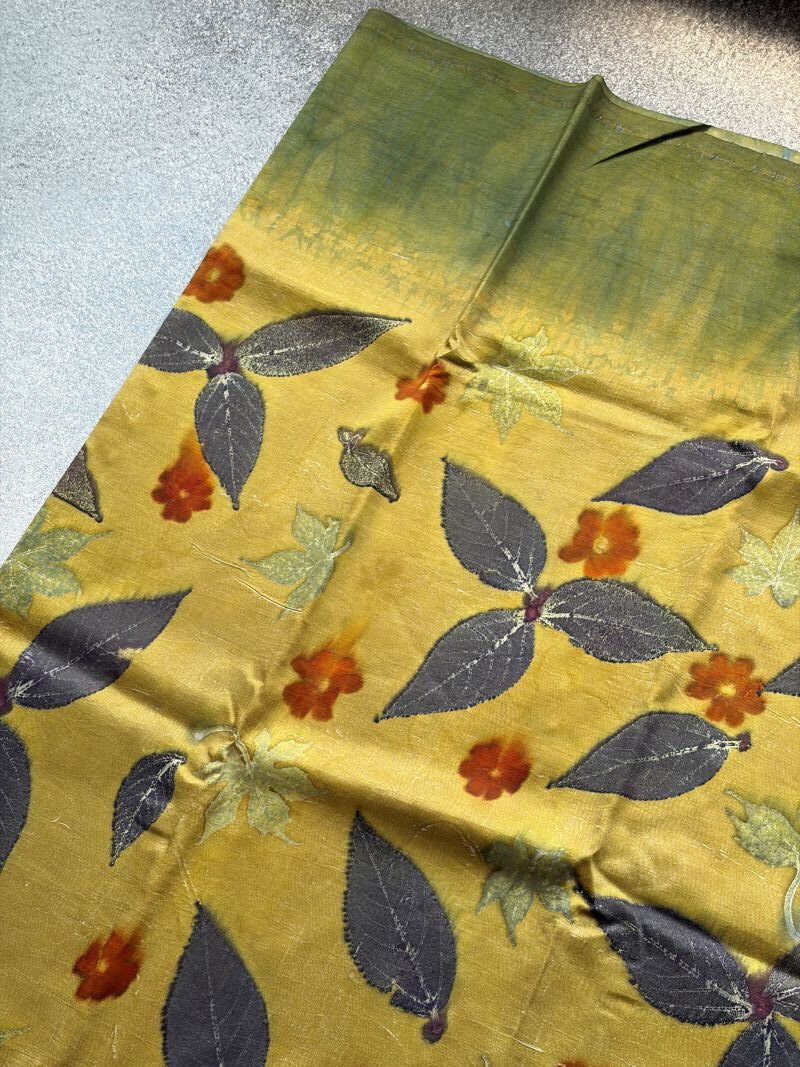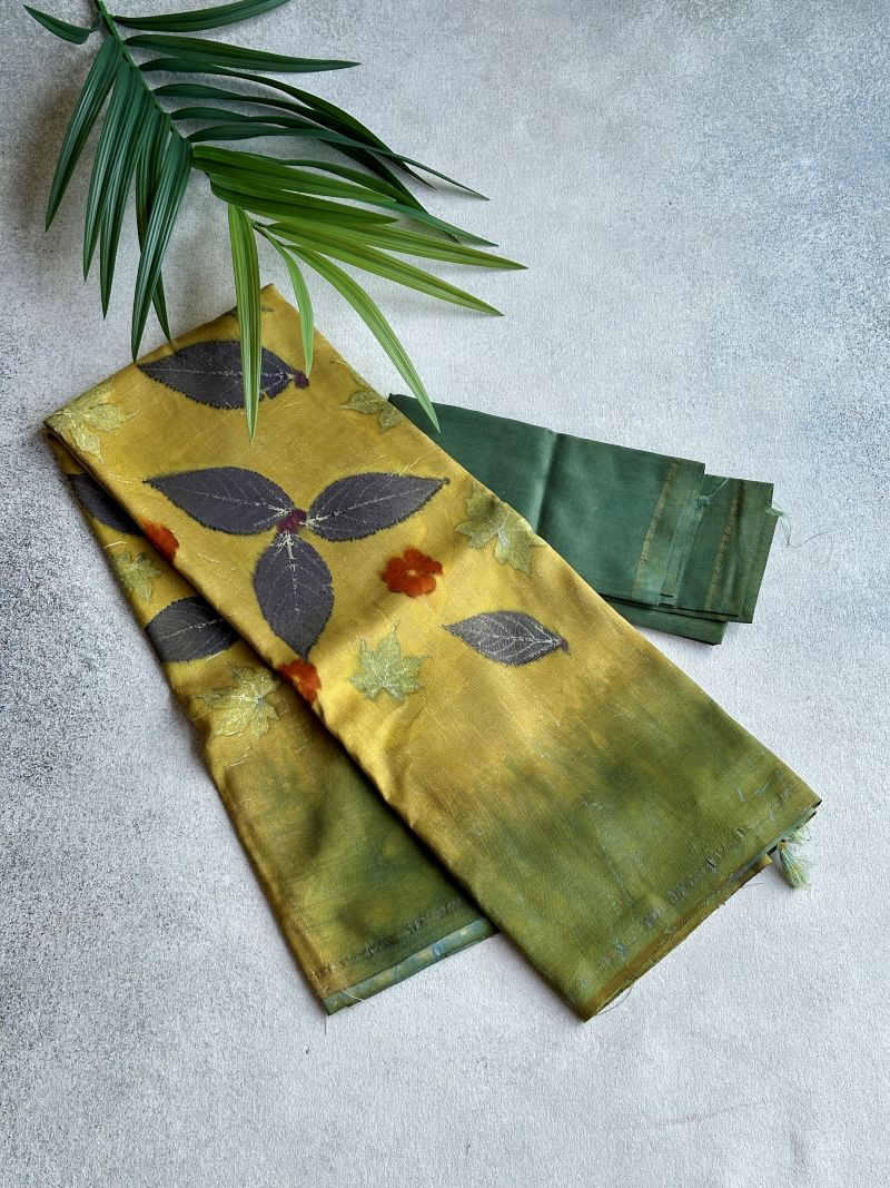 Disclaimer: The sarees on our website are handcrafted by skilled artisans using traditional techniques. As a result, each saree is unique and may have slight variations or imperfections in colour, weave, or design. These are not defects, but rather the natural beauty and charm of handmade products. Subtle discolouration or minor bleeding are natural characteristics of this beautiful eco-printed collection, adding to its unique charm and authenticity. We request you to appreciate and embrace these variations as a mark of authenticity and quality. Thank you for choosing our sarees.
