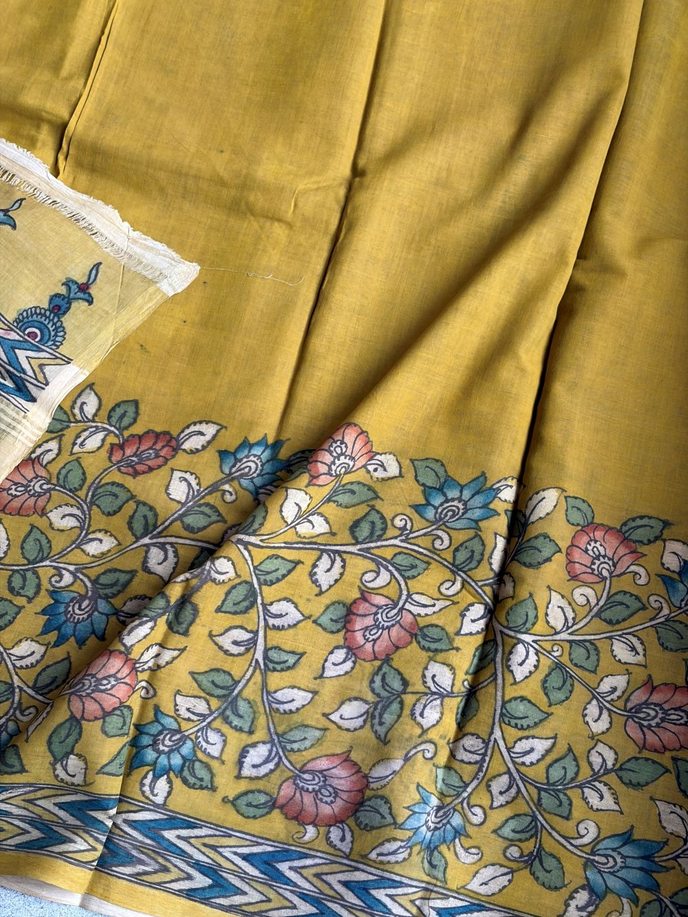 Rooted in nature and crafted for comfort—this 120 count Madurai handwoven cotton saree brings together ease and artistry in the most effortless way. The earthy green body carries a calm, grounded charm, enriched with hand-drawn Kalamkari floral and creeper motifs that flow gently across the fabric.