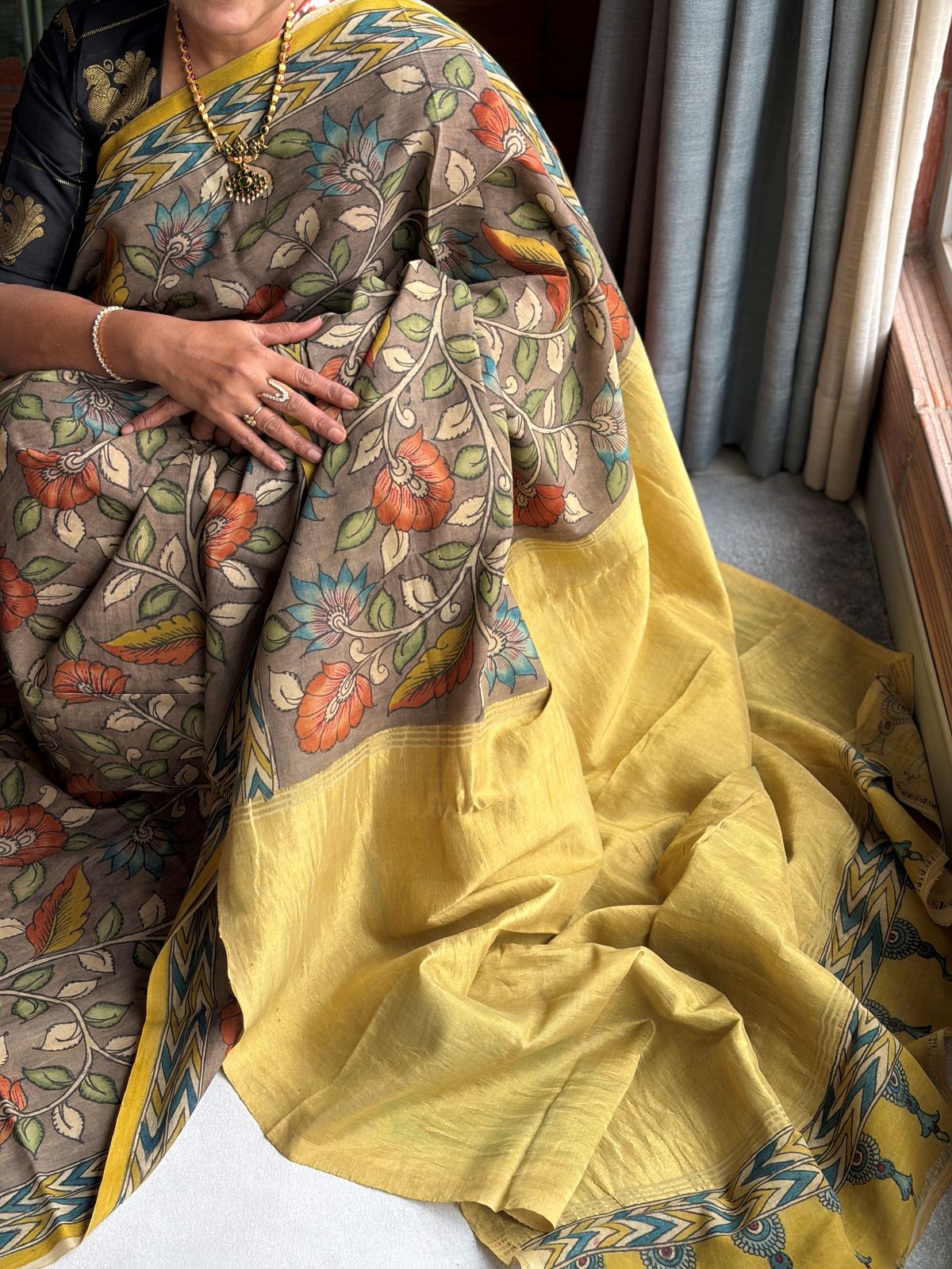 Earthy green Madurai hand-woven cotton with Kalamkari florals, a golden zari pallu and a matching blouse