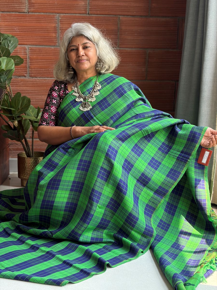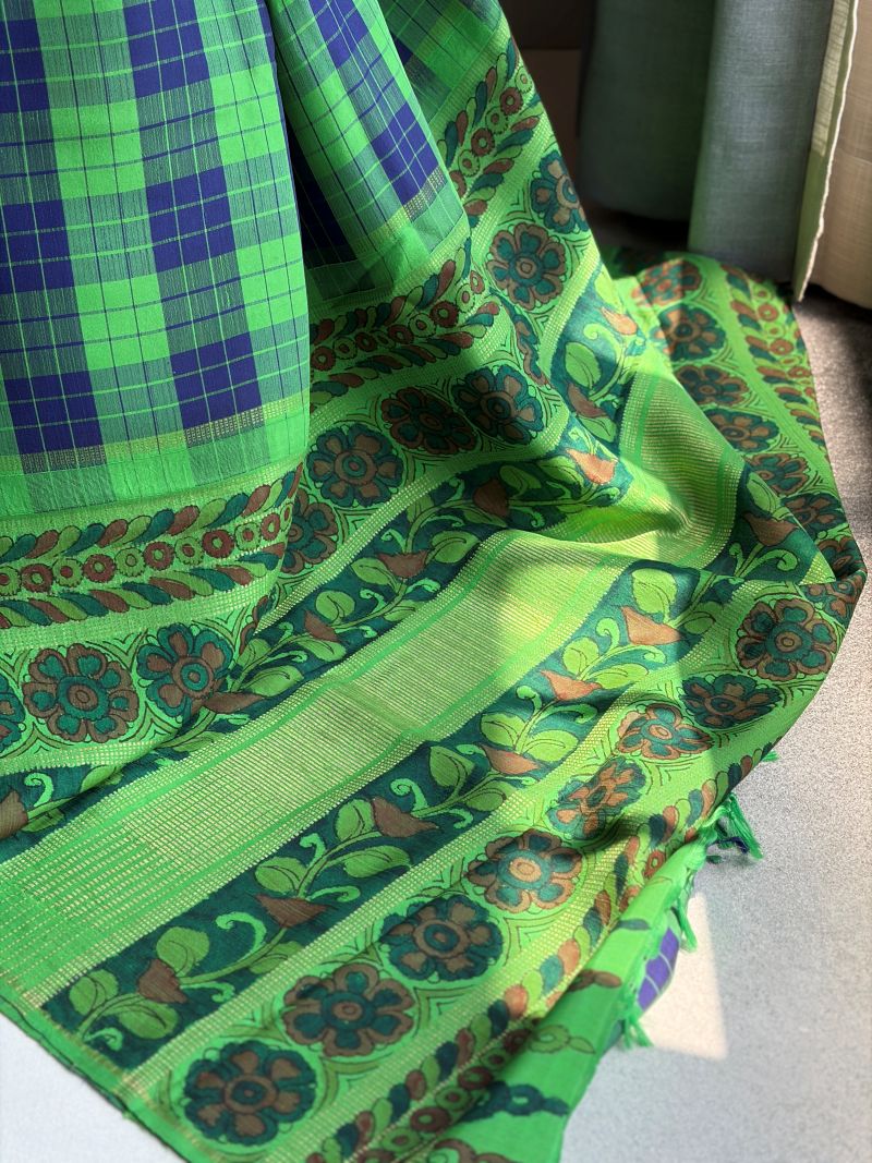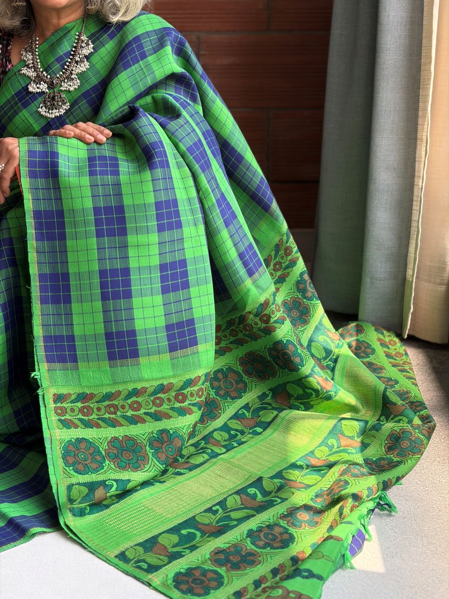 Earthy checks on Kanchi silk paired with green pallu and Kalamkari art that breathes tradition.