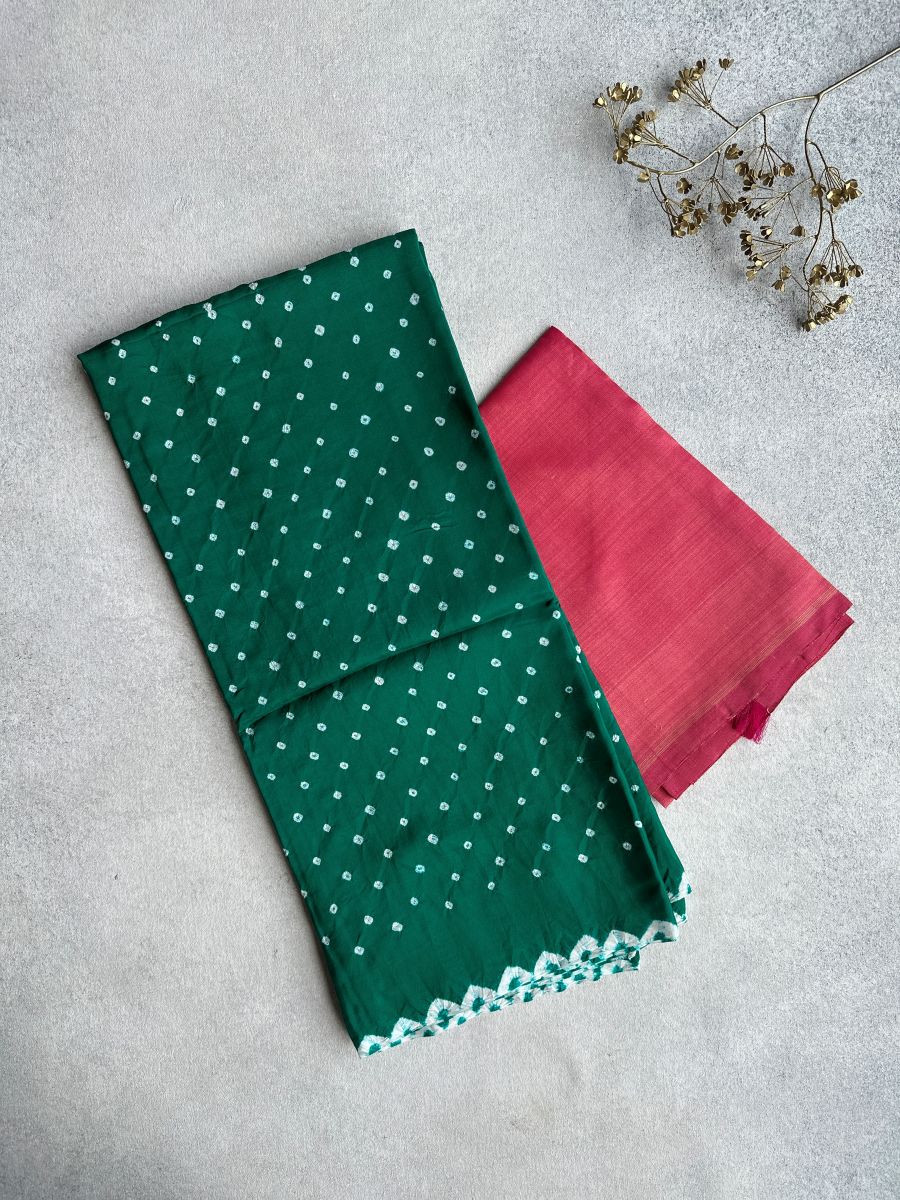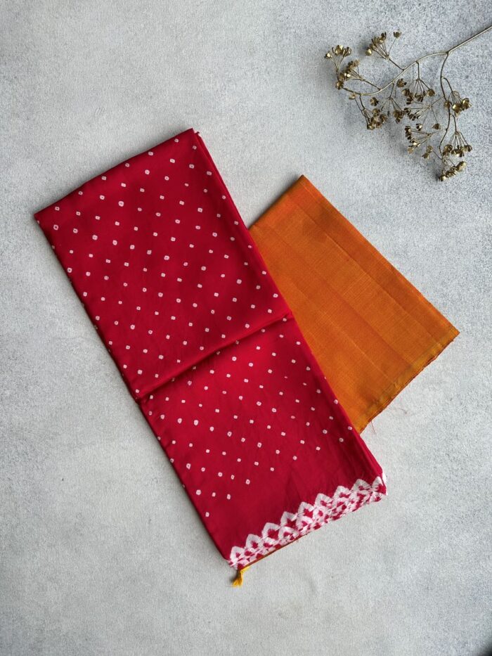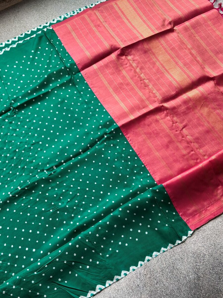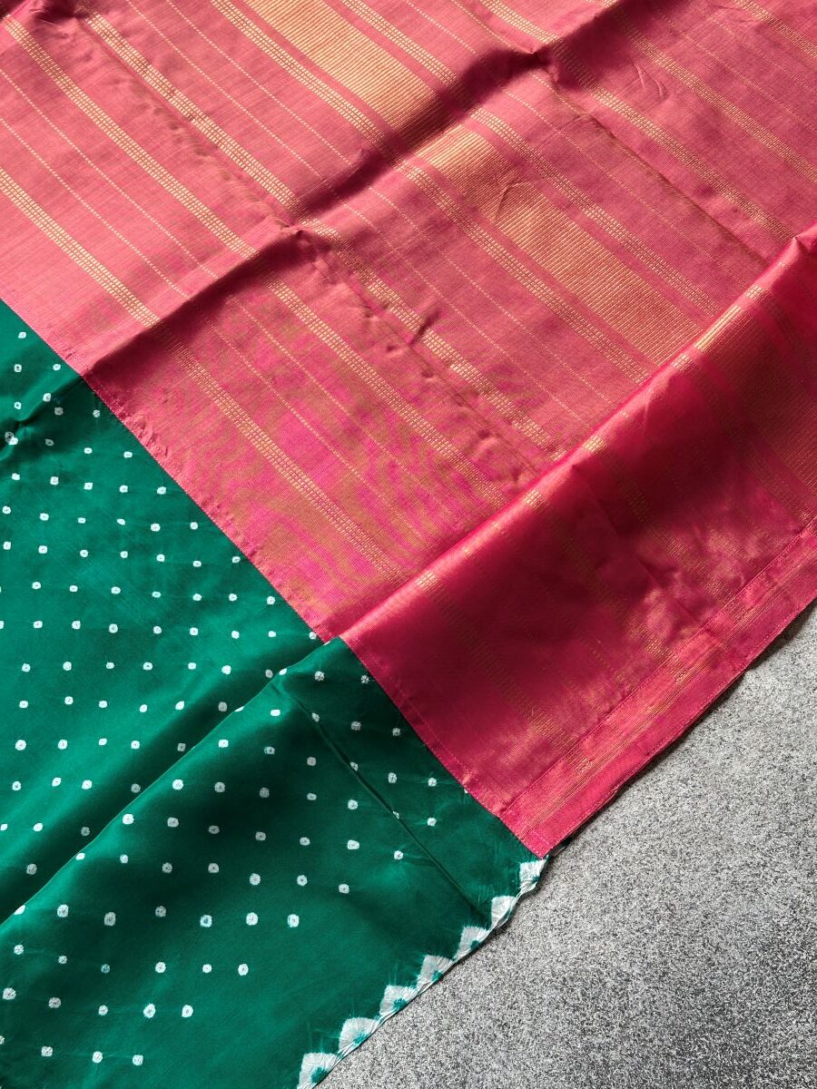 A luminous blend of hand-knotted Bandhani and Kanchipuram seer zari — crafted on Mulberry silk to honour our artisans and their slow-made legacy of luxury.