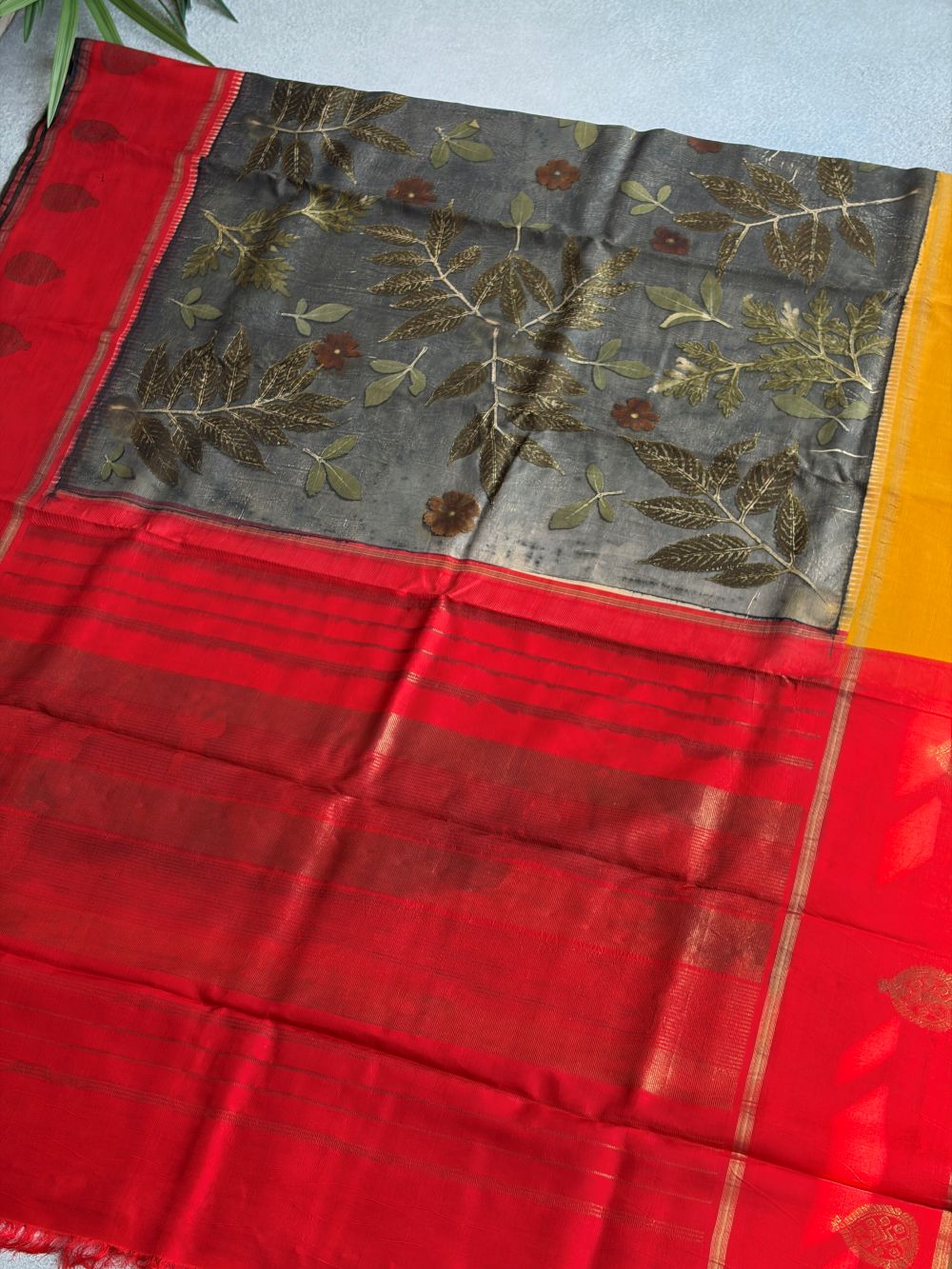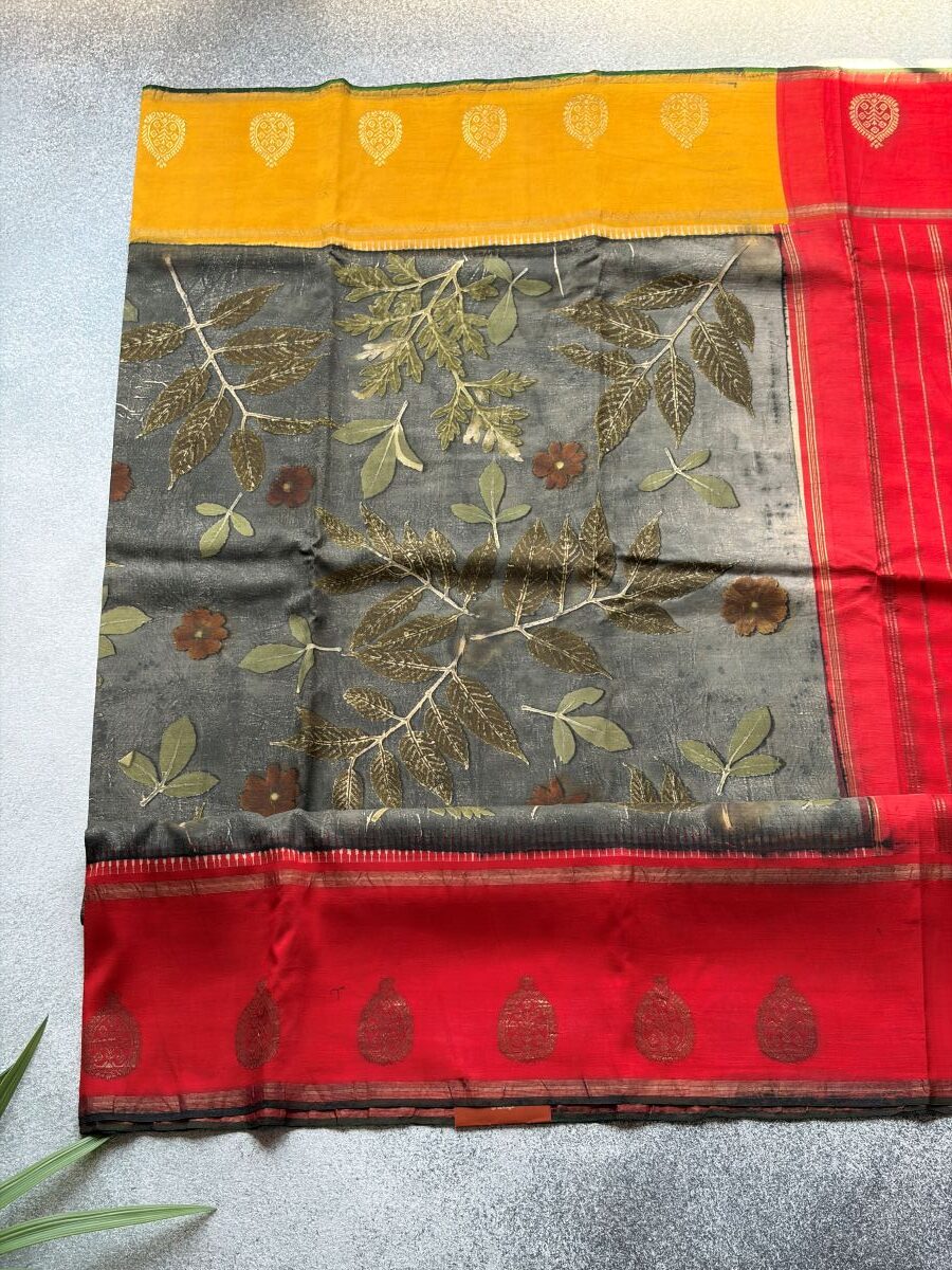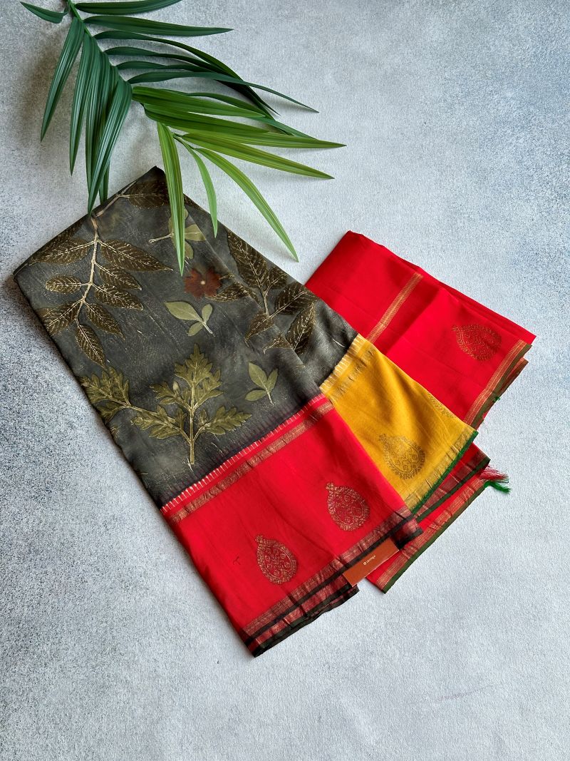 An exquisite fusion of tradition and earth-inspired design, this eco-printed Korvai Kanjivaram silk saree features striking Ganga Jamuna borders in red and yellow. The grey-toned body blooms with intricate eco prints of leaves and petals — a reflection of natural artistry. Paired with a red seer zari pallu and blouse, this saree celebrates the harmony between heritage weaving and contemporary sustainable craft.