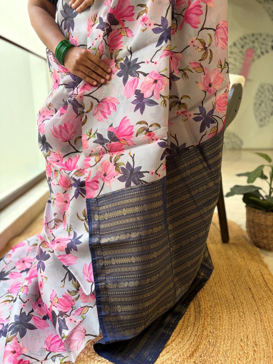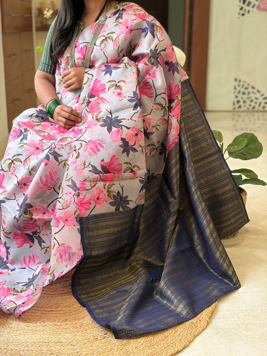 Unique grey florals with a bold midnight blue pallu—an eye-catching fusion saree that’s perfect for stylish day occasions.