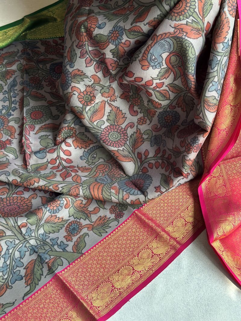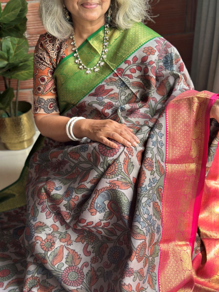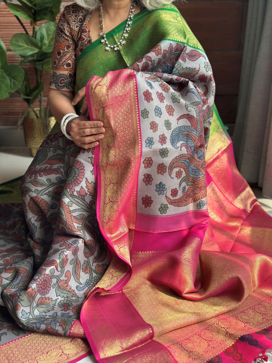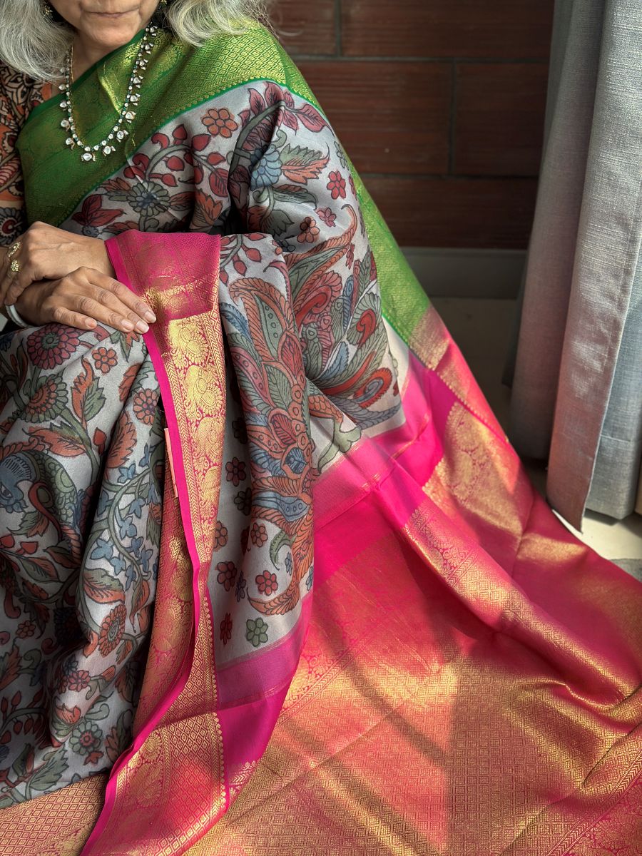 Elegant grey Kanchipuram silk brought to life with vibrant borders, hand-painted Kalamkari tales, and a festive pink Zari pallu.
