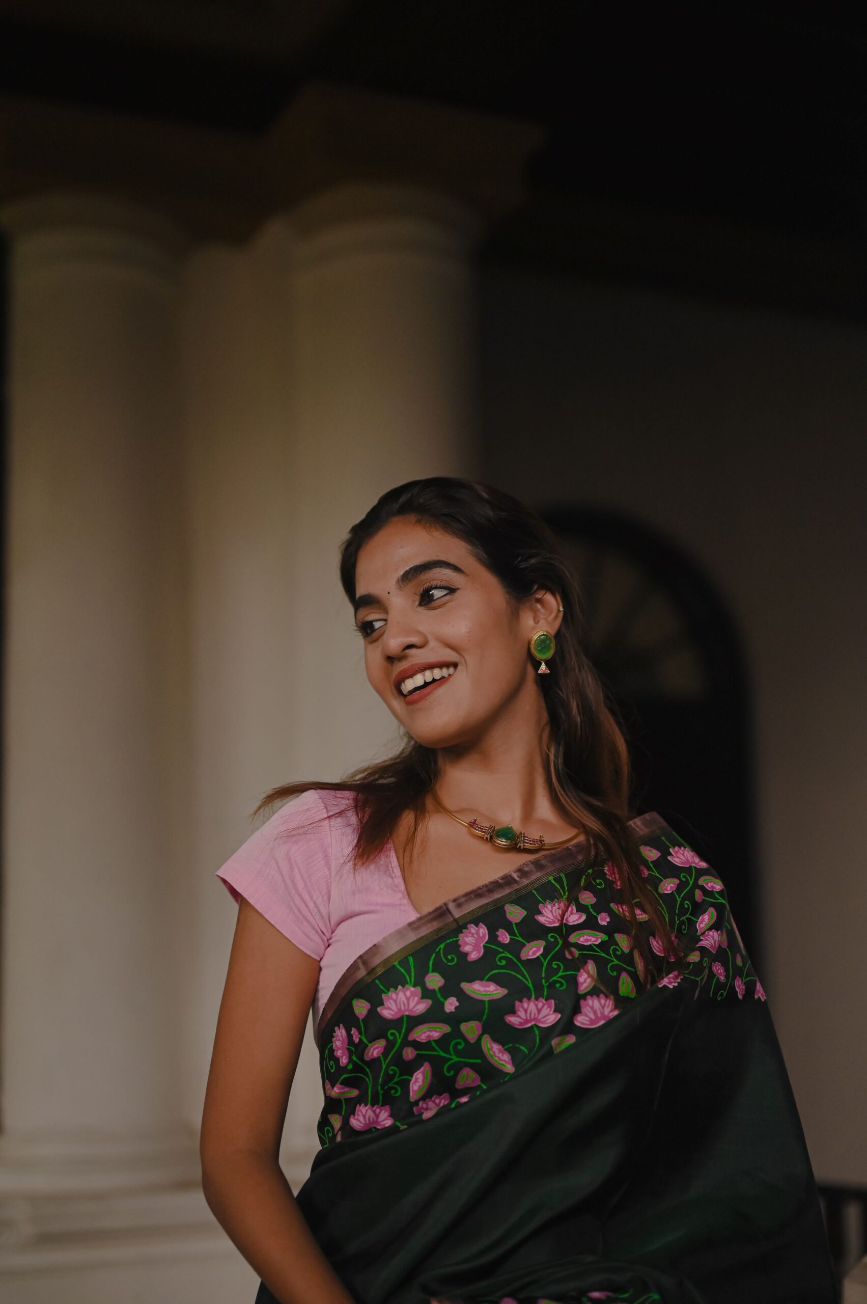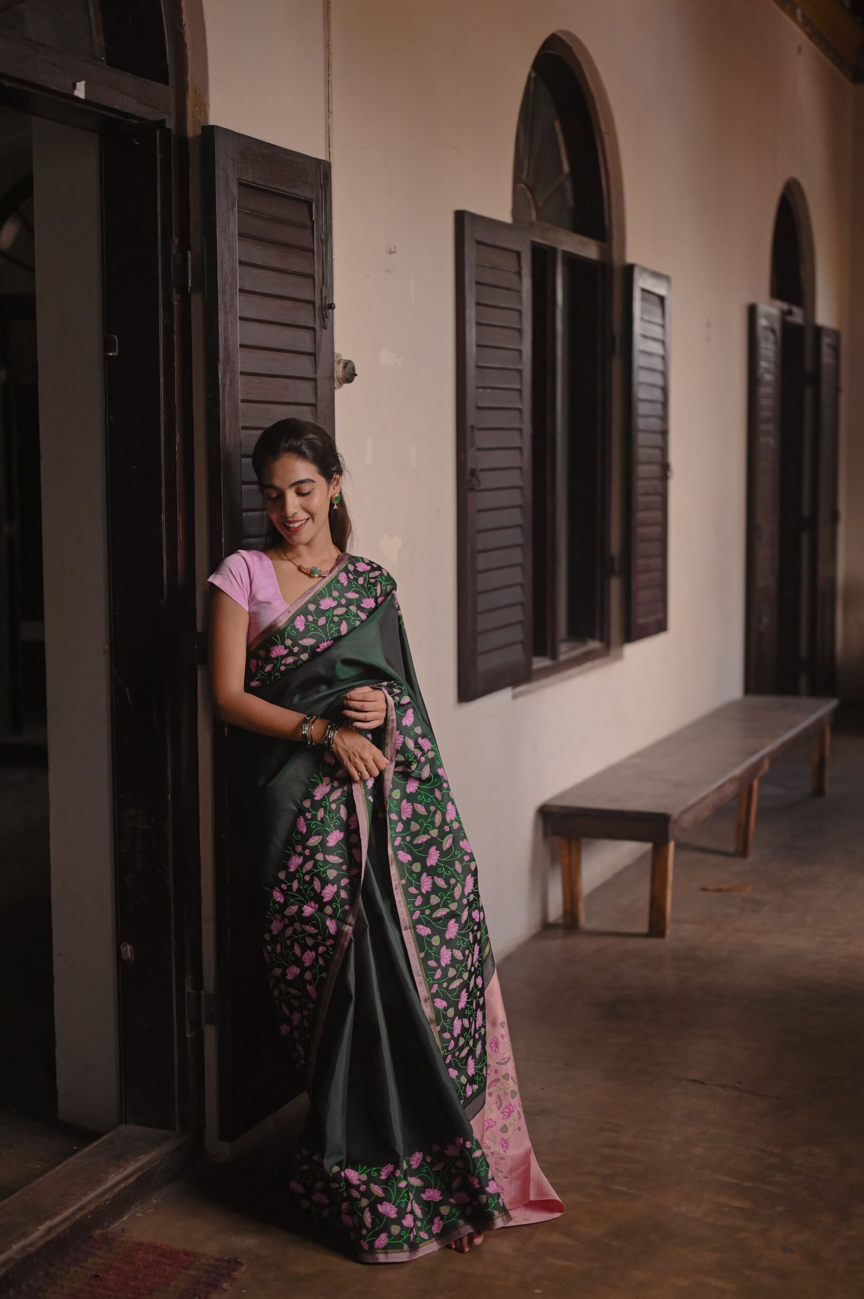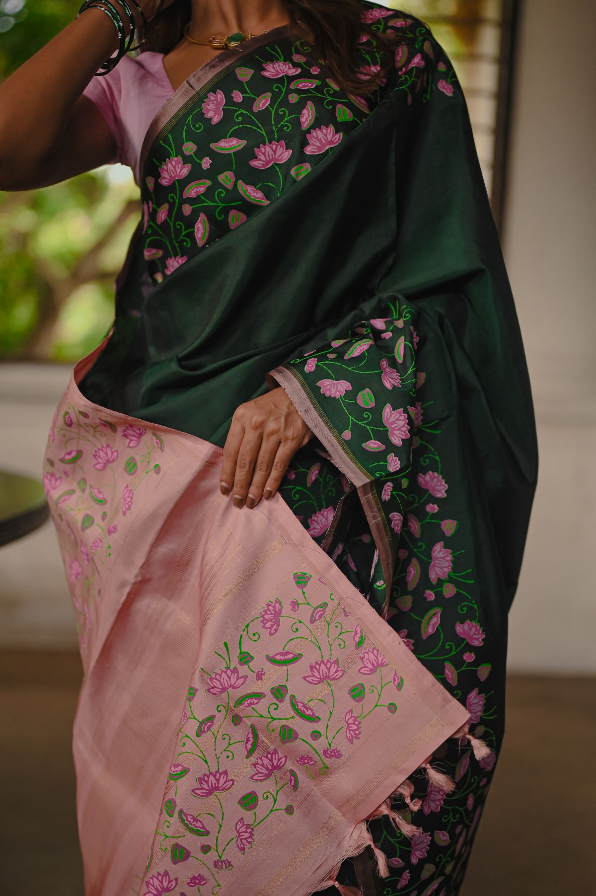 Enthrall in Bottle Green Handblock Kanjivaram silk, highlighted by pink lotus creeper prints and elegant zari selvedge.
