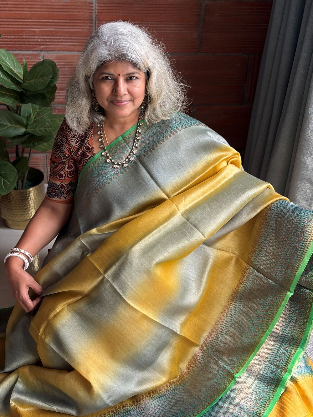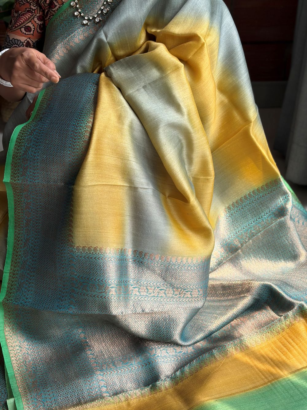 This exquisite handwoven Benarasi Tusser silk saree carries the calm of spring in its colour story. The body features soothing yellow and blue stripes that flow gently across the textured silk, creating a balanced and luminous surface. A blue zari border framed with a touch of green selvedge adds refined contrast and depth. The rich Benarasi pallu enhances its ceremonial charm, while the coordinated blue blouse with zari border completes the ensemble. Soft yet structured, this saree feels serene, graceful and season ready.