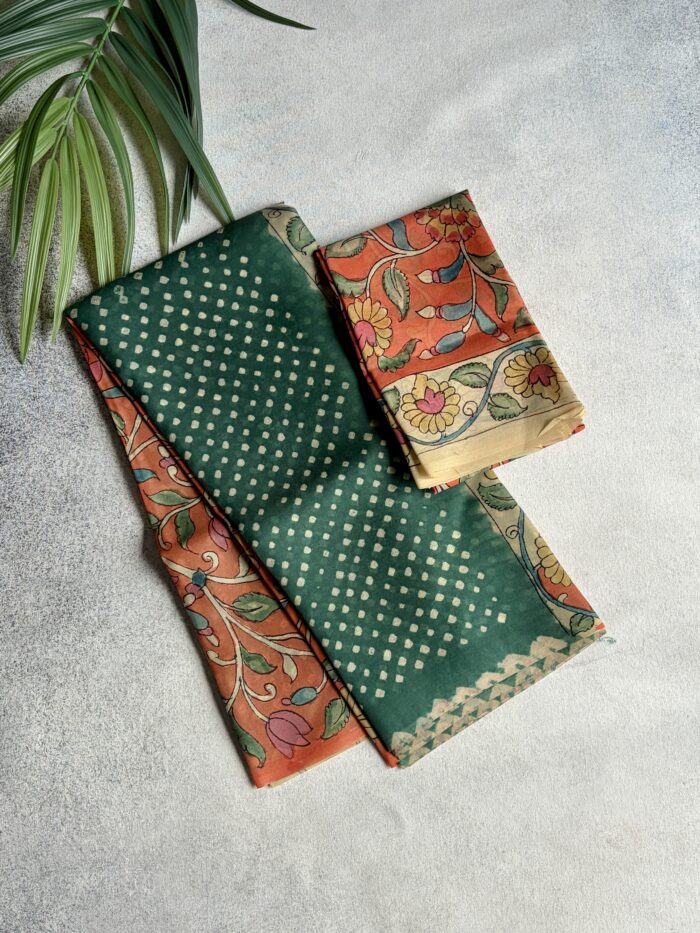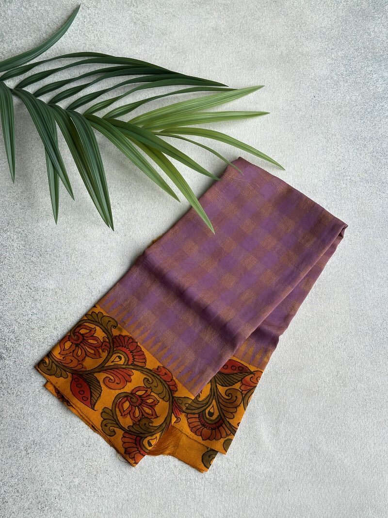Where heritage meets versatility. The body features delicate zari checks that shimmer subtly, while the borders bloom with hand-painted Kalamkari, bringing nature and tradition alive in stunning color combinations.