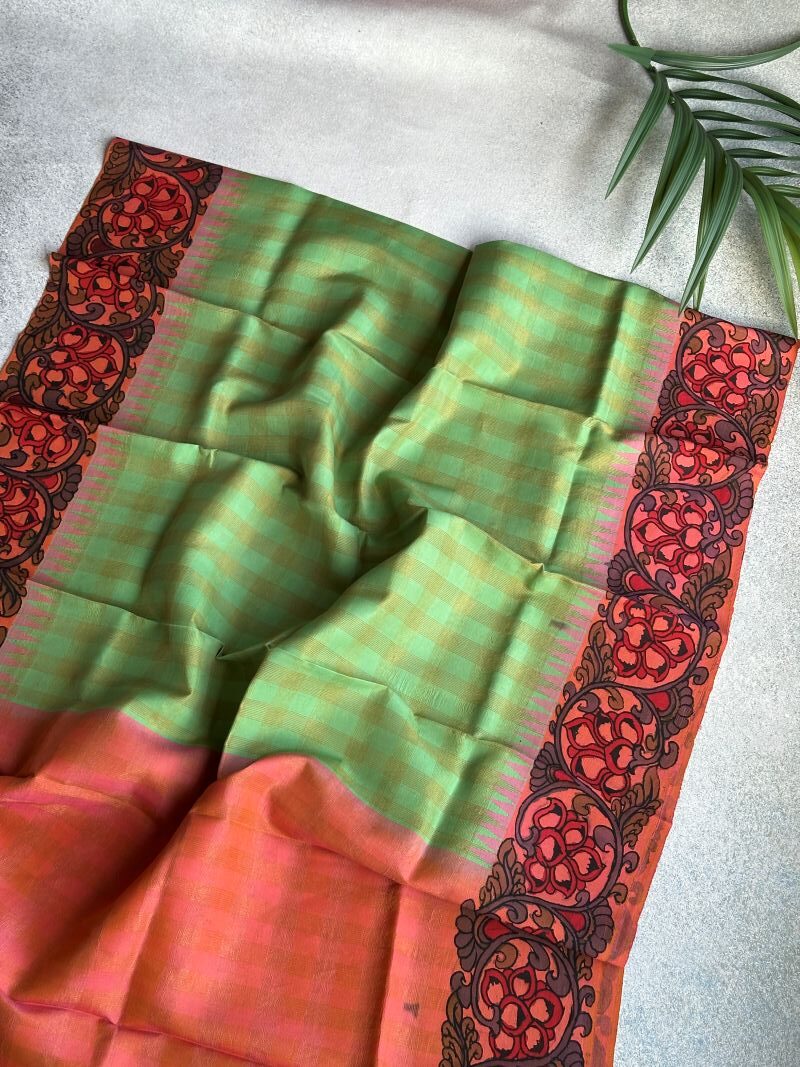 🌿 Each stroke of Kalamkari breathes life into the glowing zari checks of Gadwal silk, creating a festive heirloom.