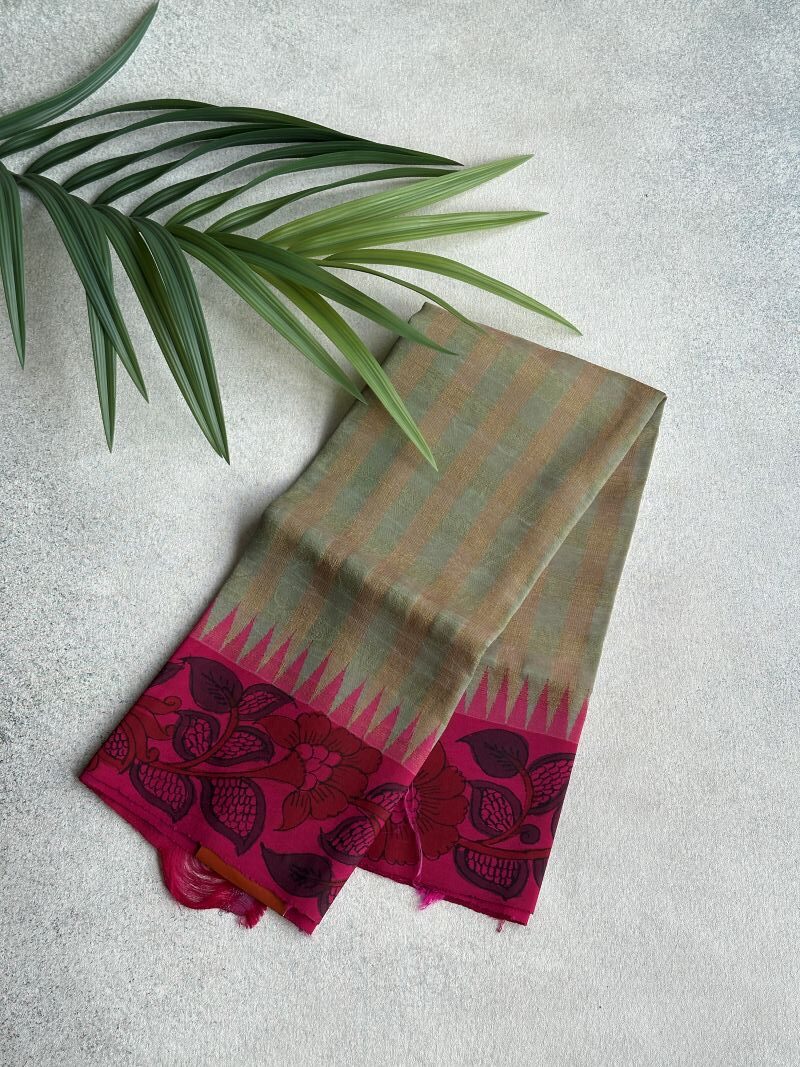Where heritage meets versatility. The body features delicate zari checks that shimmer subtly, while the borders bloom with hand-painted Kalamkari, bringing nature and tradition alive in stunning color combinations.