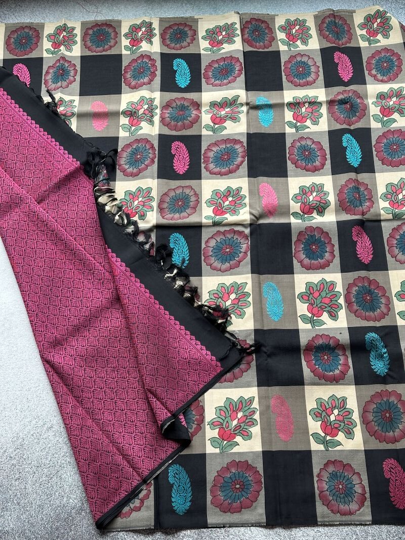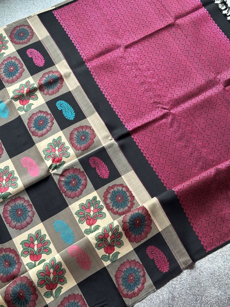This Kanchipuram silk saree explores contrast through colour, texture and technique. A unique kattam layout brings together cream, grey and black in a balanced interplay. The cream sections carry hand-drawn floral Kalamkari, soft and expressive, while the black panels are enriched with thread-woven paisley motifs that add depth and structure. Finished with a rich jacquard threadwork pallu, this saree moves between surface art and weaving with ease. Distinctive and thoughtfully composed, it reflects a layered approach to traditional silk.