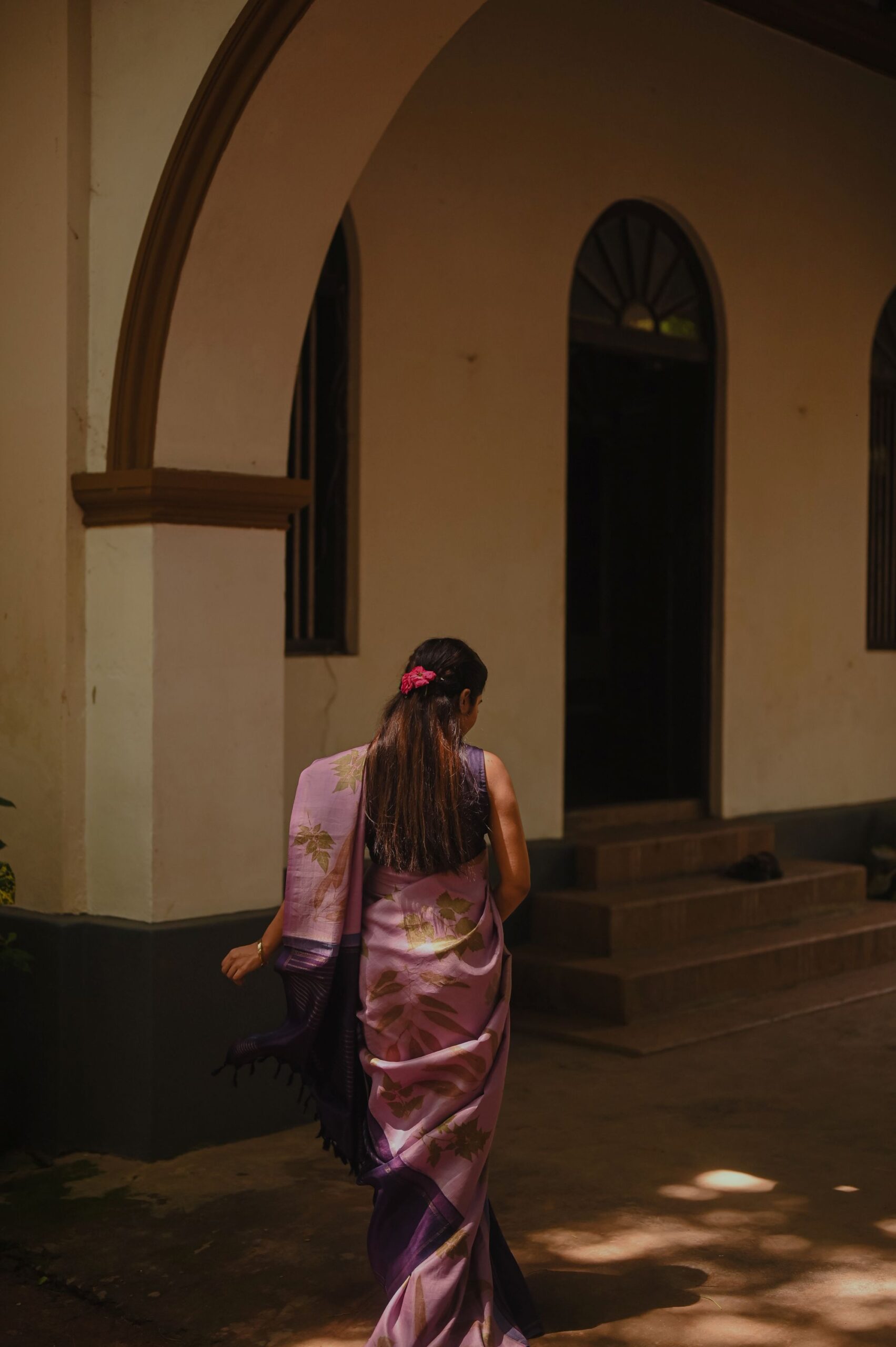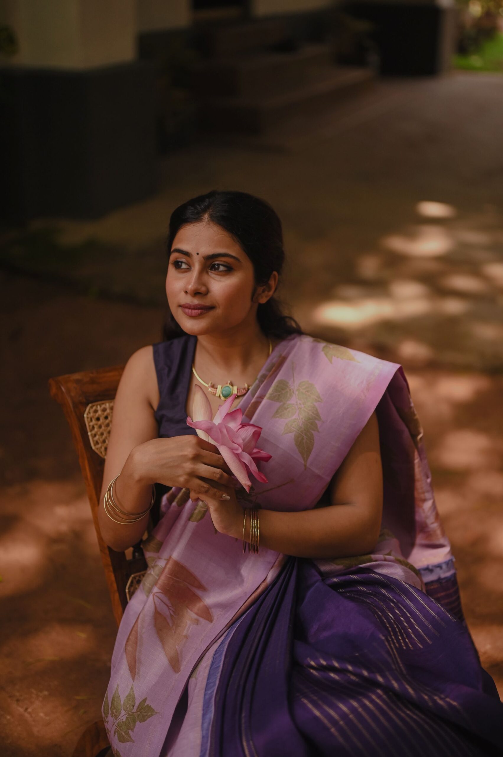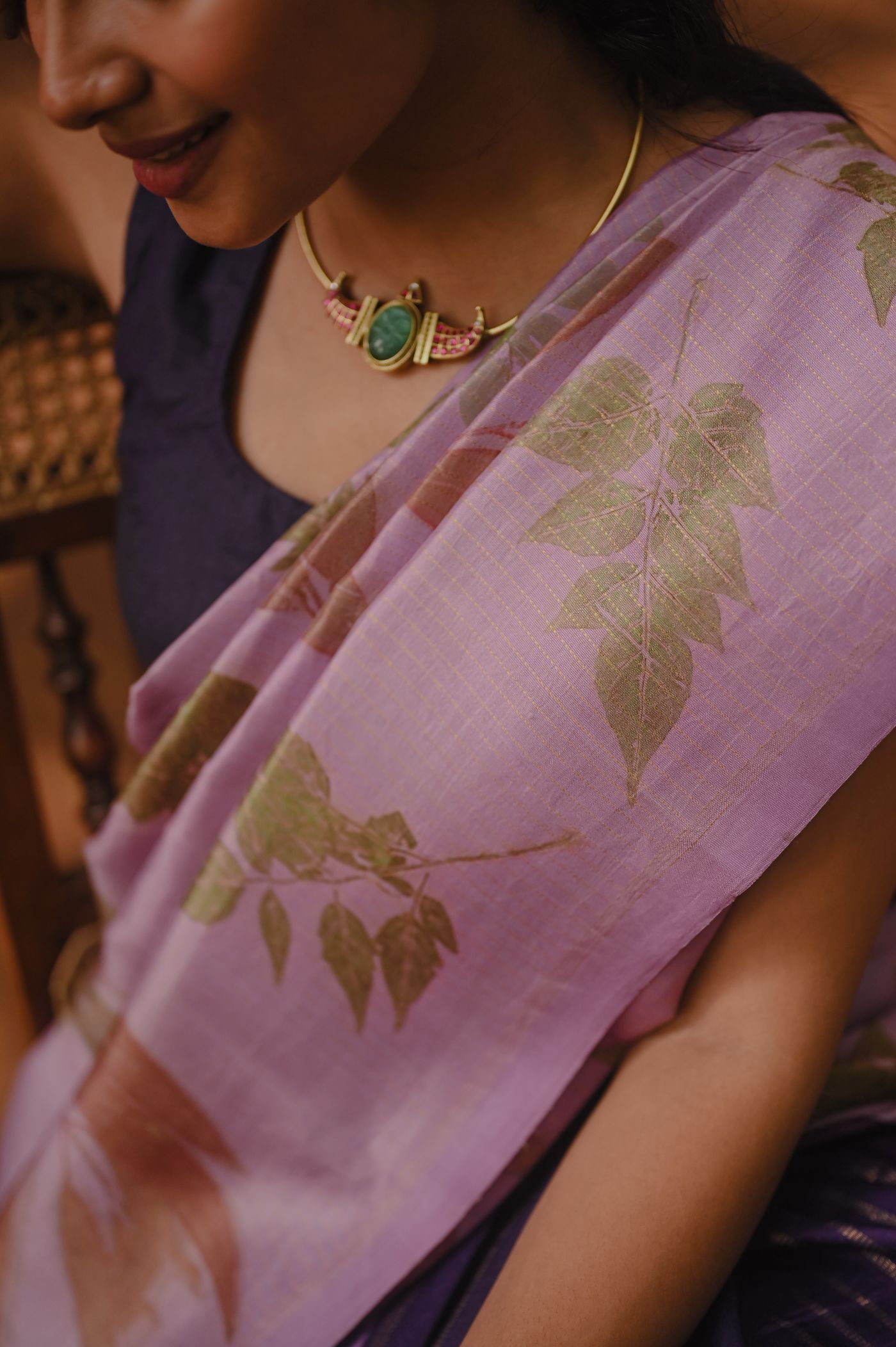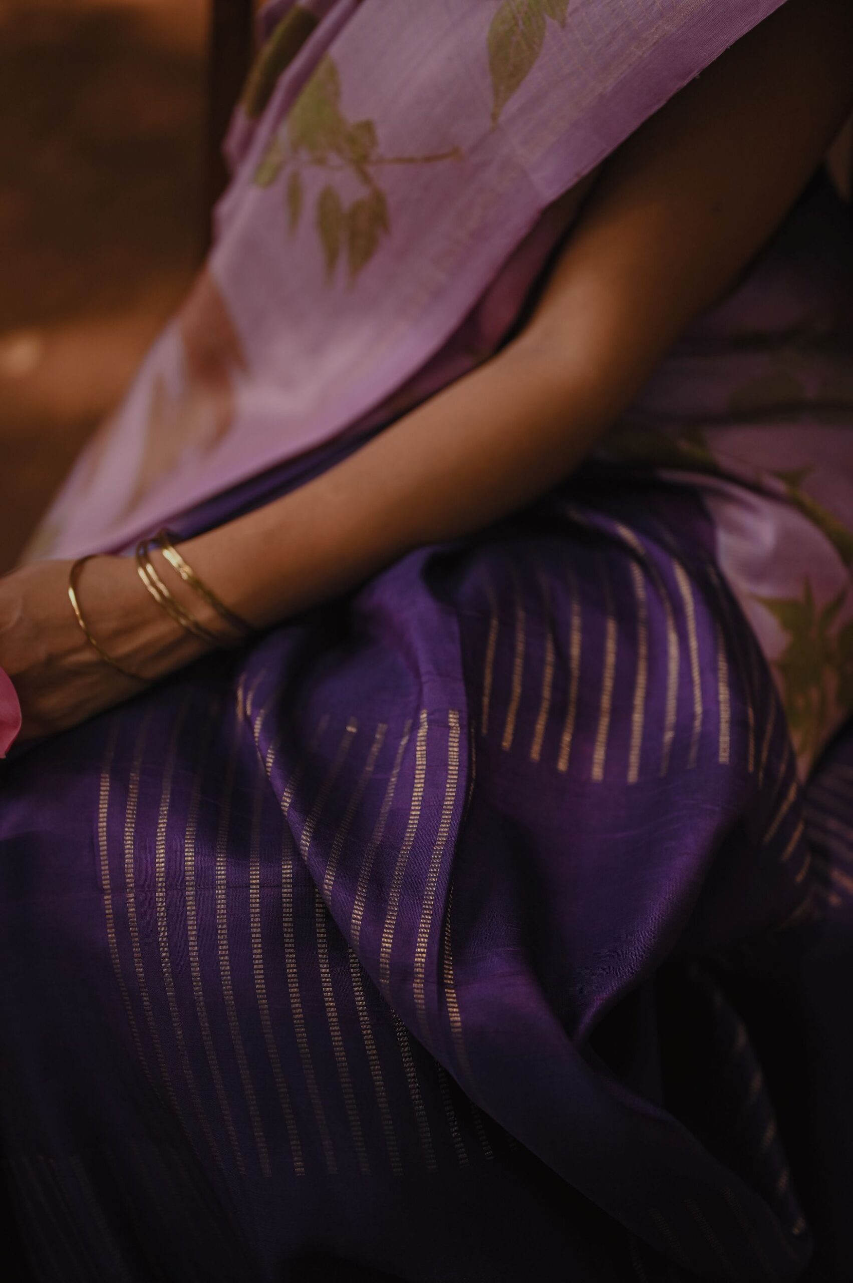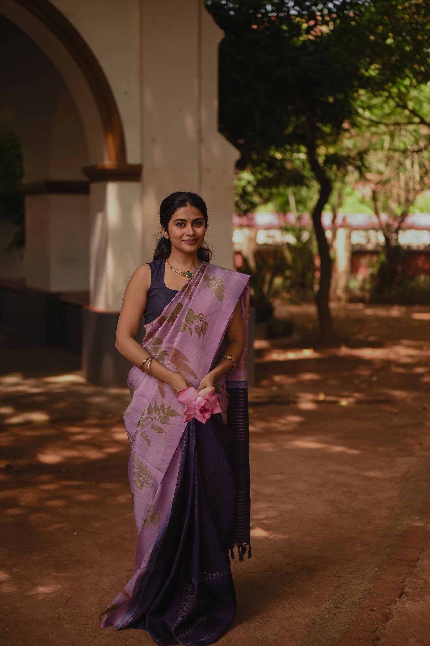 Eco-printed lavender Kanjivaram silk with botanical motifs, box zari pleats, and purple pallu. Agai’s ஊதா பூ – where nature’s artistry meets heritage craftsmanship in sustainable luxury.