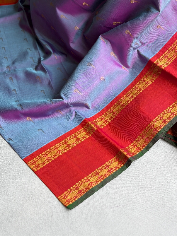 A richly woven Gadwal silk saree in a vintage-inspired colour palette, where depth meets timeless character. The body is defined by a dense spread of muniya buttas, creating a textured rhythm that feels both intricate and composed.