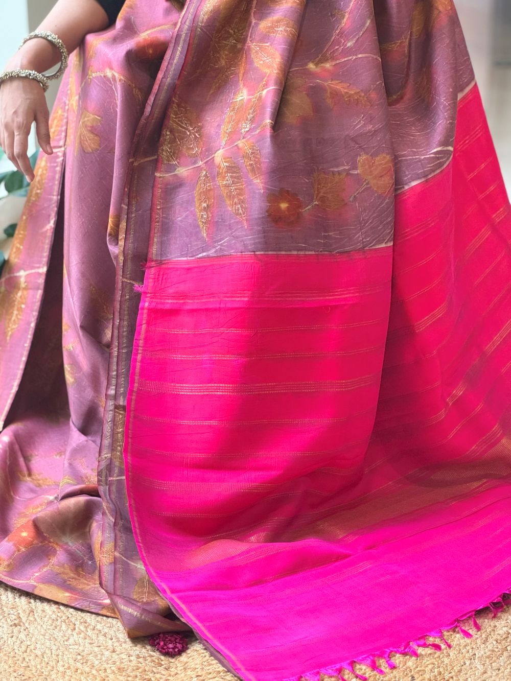 Disclaimer: The sarees on our website are handcrafted by skilled artisans using traditional techniques. As a result, each saree is unique and may have slight variations or imperfections in colour, weave, or design. These are not defects, but rather the natural beauty and charm of handmade products. Subtle discolouration or minor bleeding are natural characteristics of this beautiful eco-printed collection, adding to its unique charm and authenticity. We request you to appreciate and embrace these variations as a mark of authenticity and quality. Thank you for choosing our sarees.