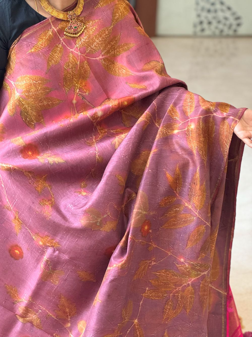 A graceful fusion of nature and tradition, this eco-printed silk saree brings botanical beauty to life with every drape.