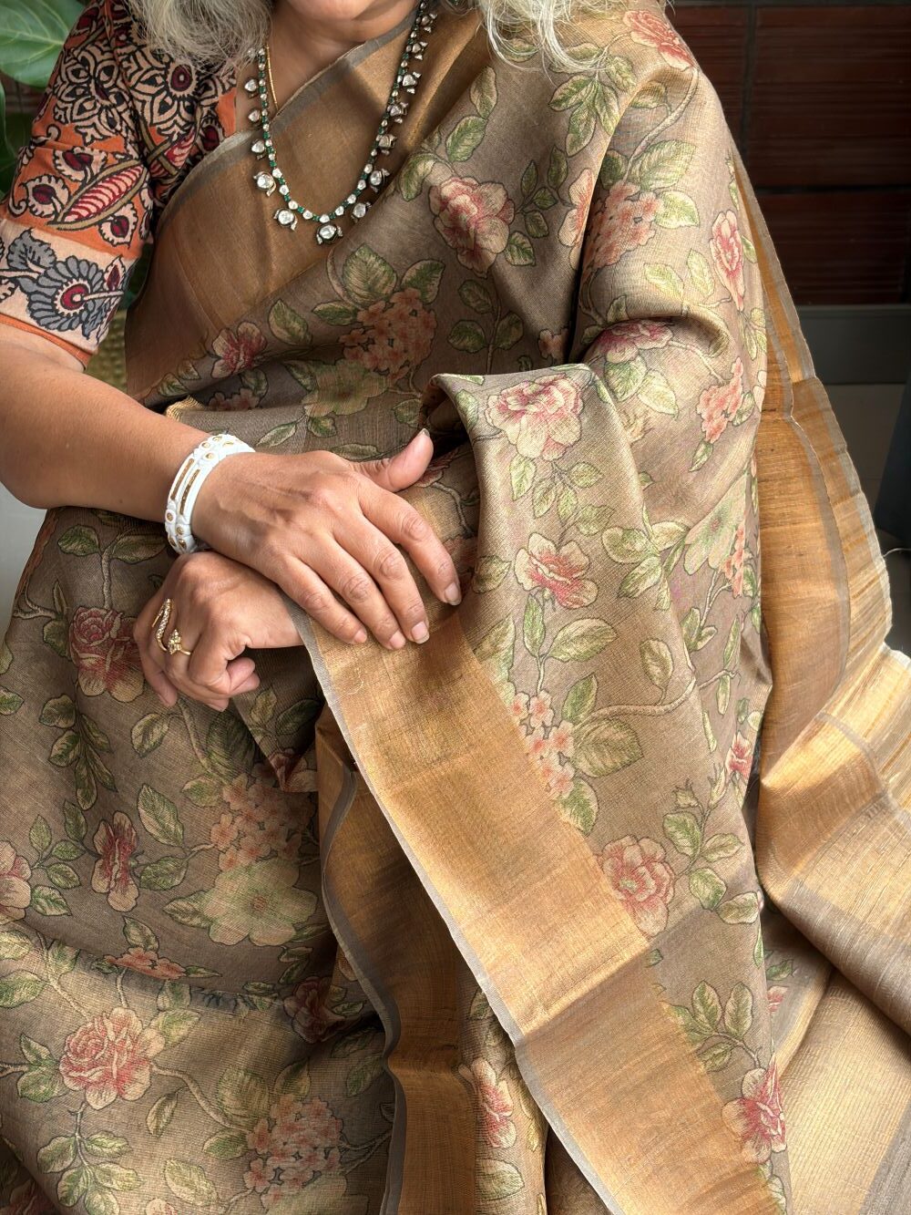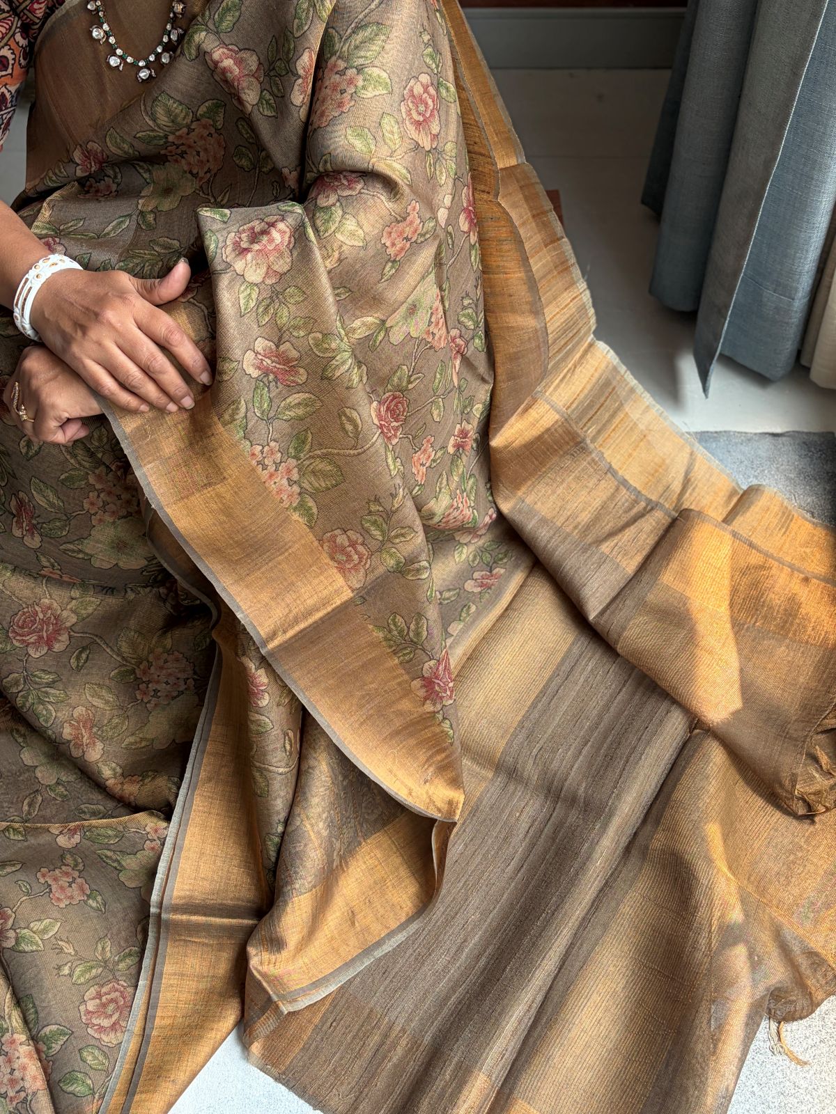 Molten golden handwoven tissue Tusser silk saree with floral prints, zari border, rich pallu and subtle floral blouse with zari border.