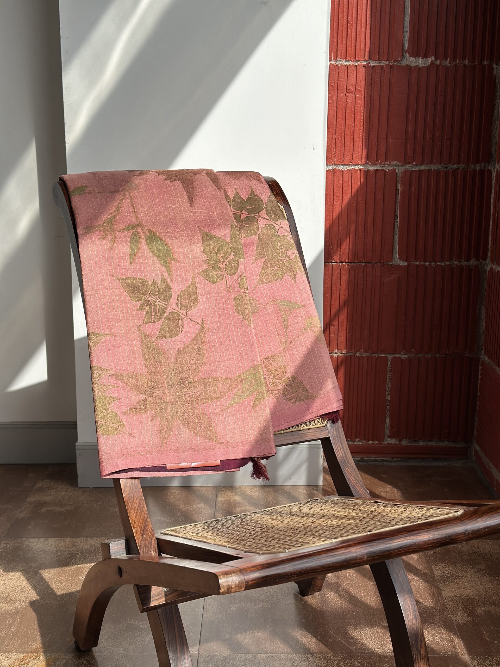 Our salmon pink eco-printed Kanjivaram silk saree carries that same stillness. The soft thread stripes cradle delicate leaf imprints, while the wine seer zari pallu adds depth, grace, and heritage.