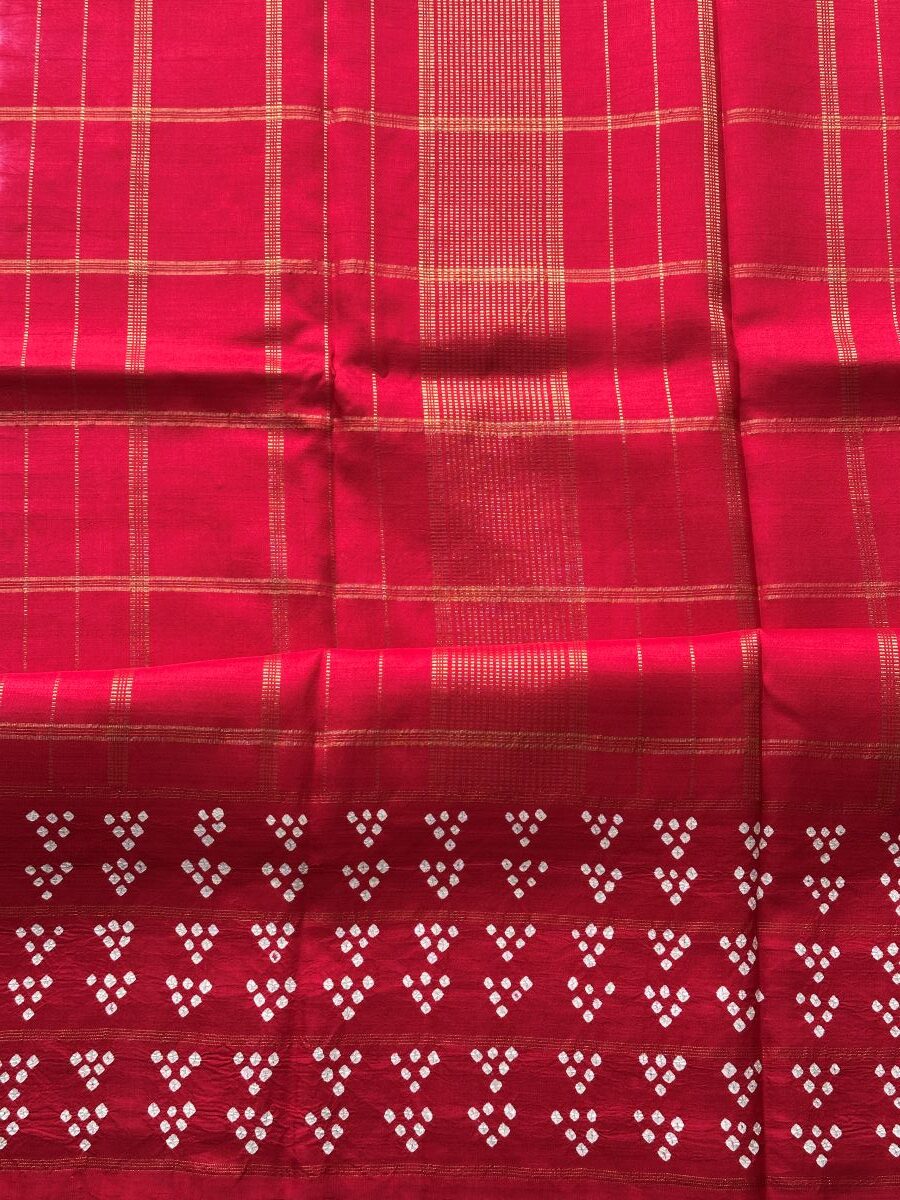 A tribute to timeless artistry, this Akkana saree in Pastel Pink Kanchi silk captures the essence of hand-knotted heritage. It’s pure zari checks shimmer softly beneath intricate Bandhani motifs. Each knot a patient act of devotion by skilled artisans. The vibrant contrast red pallu and blouse add a celebratory rhythm, balancing grace with strength. Finished with Bandhani borders, this drape embodies quiet luxury, where every thread whispers of tradition, craft and continuity.