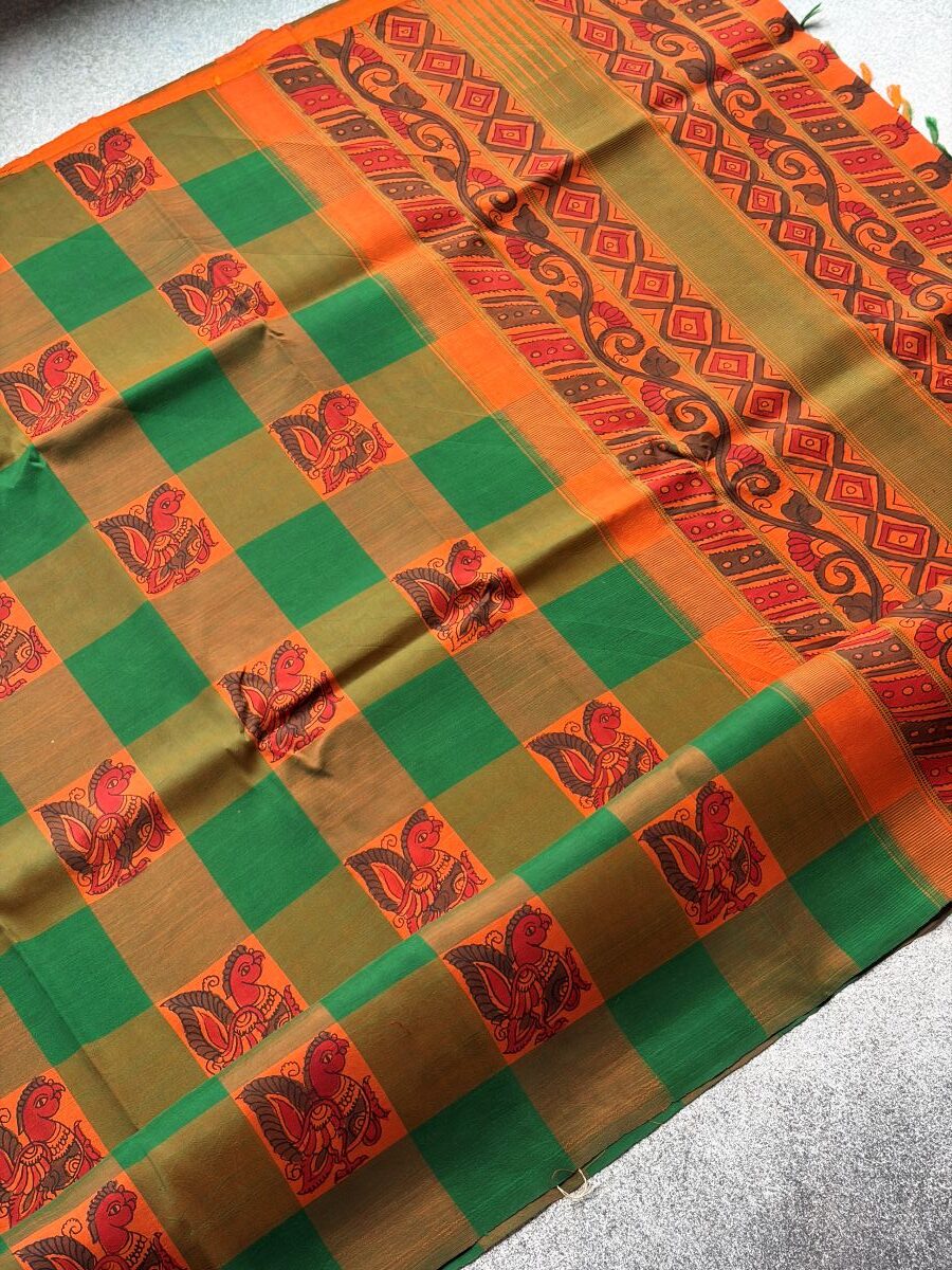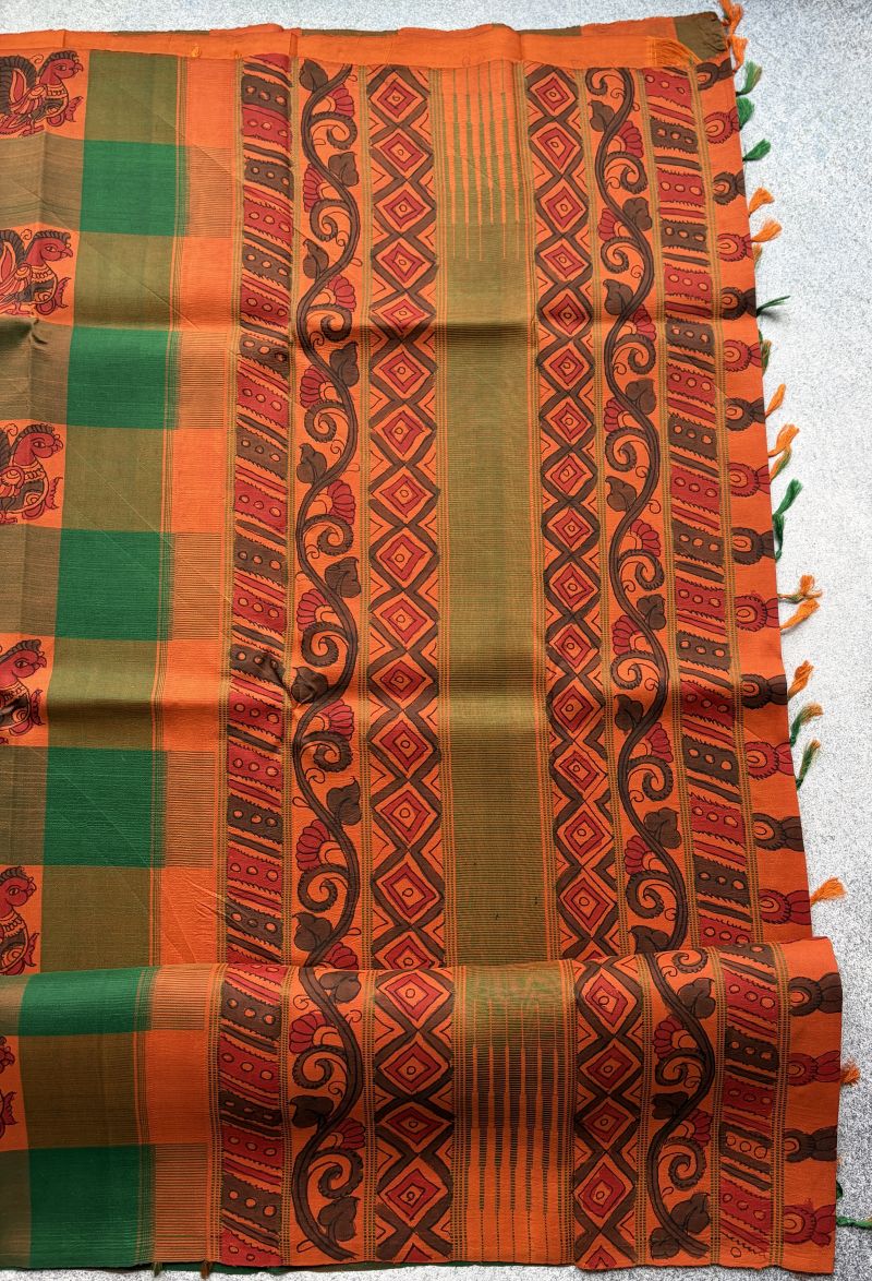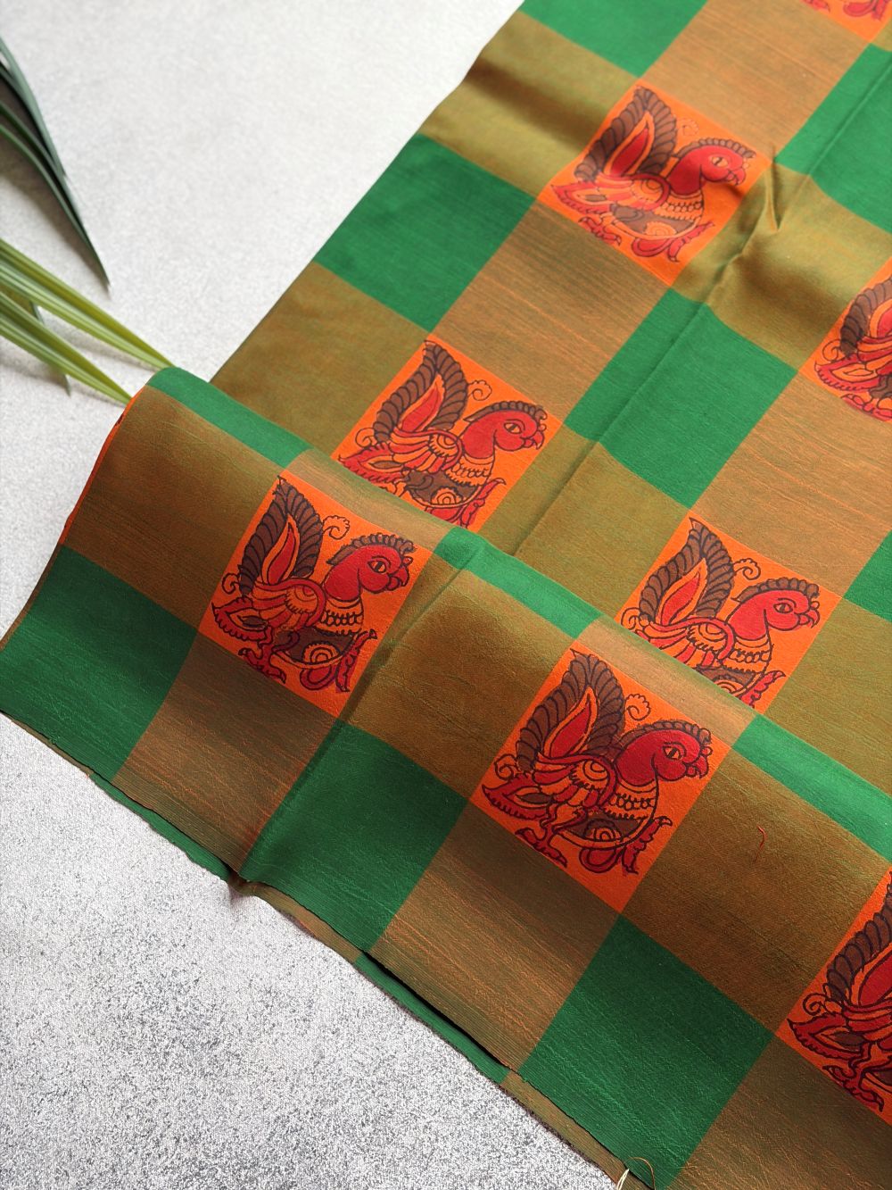 Zero zari Kanchipuram silk saree with orange green checks, hand-drawn Kalamkari peacock motifs and orange thread seer pallu with intricate Kalamkari detailing.