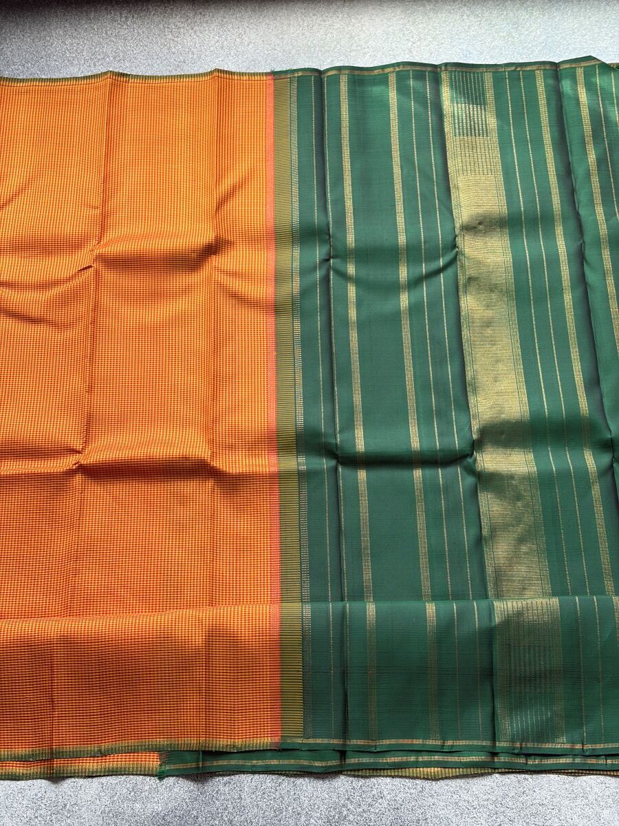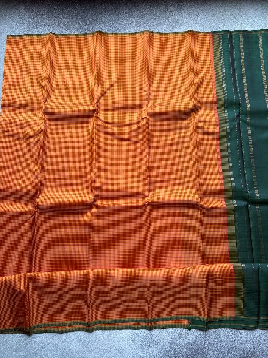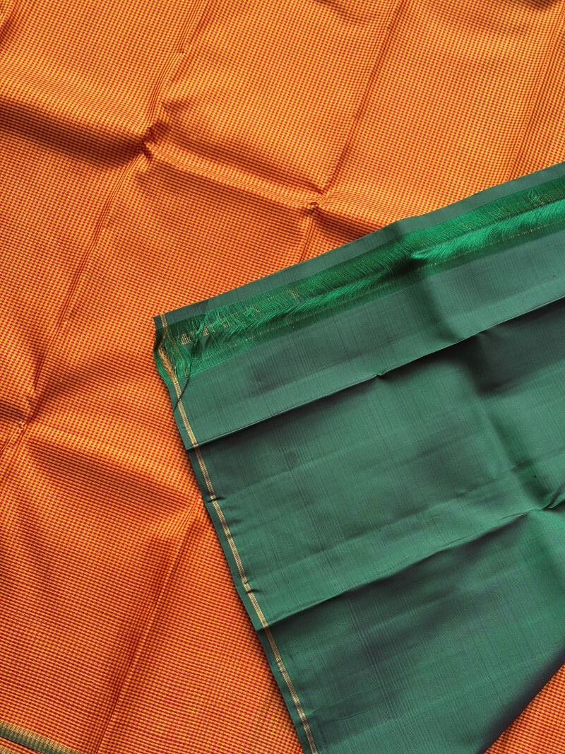 Orange and rust pure zari Kanchipuram silk saree with podi kattam weave, green seer zari pallu and green blouse with zari selvedge.
