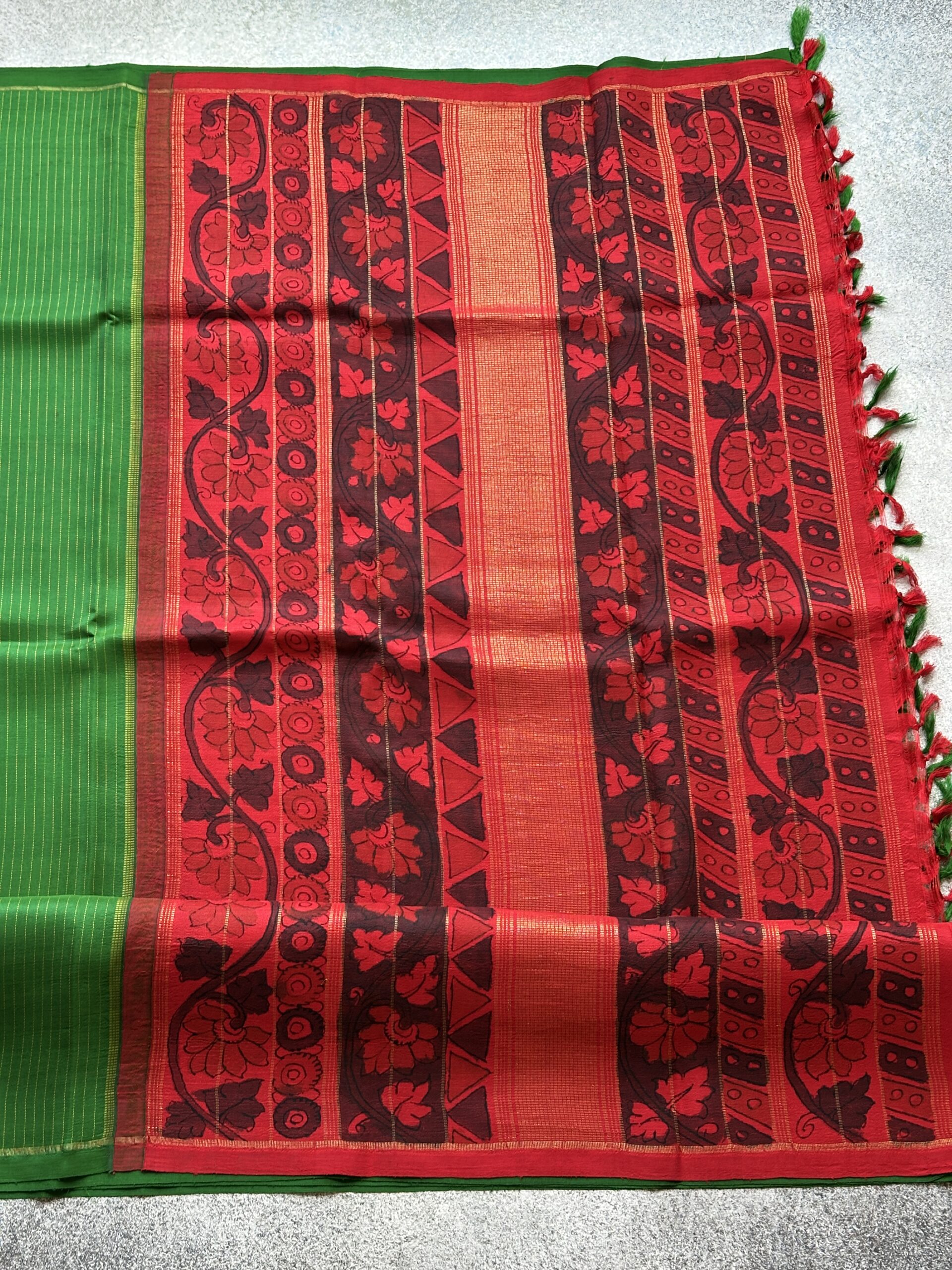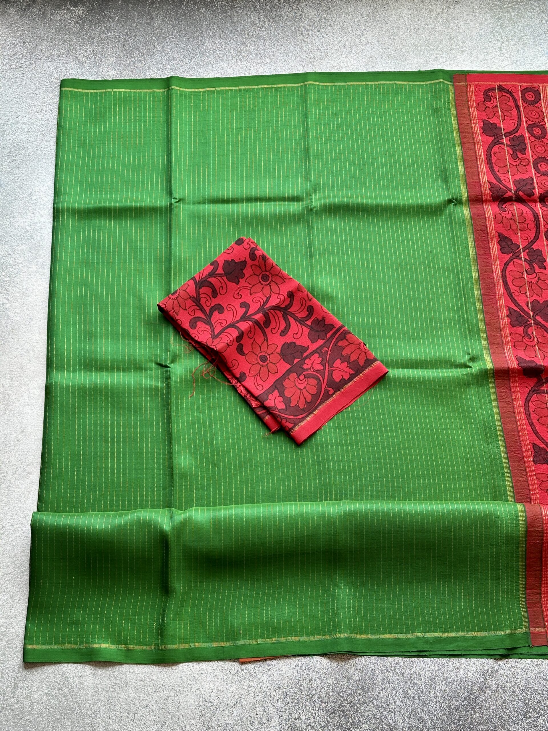 Vivid green Kanchi silk with red Kalamkari pallu and blouse—crafted to radiate festive grace and timeless artistry.