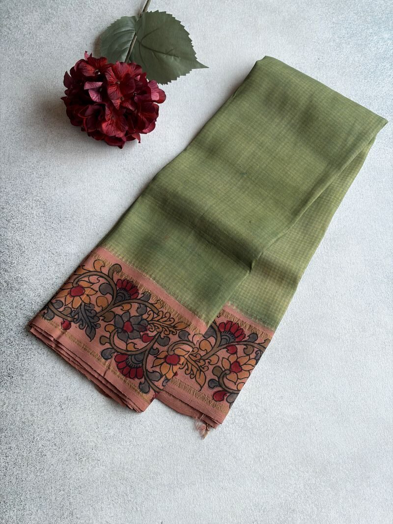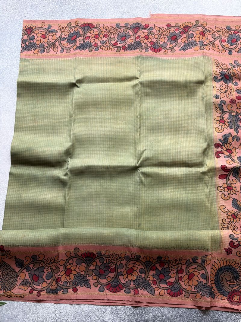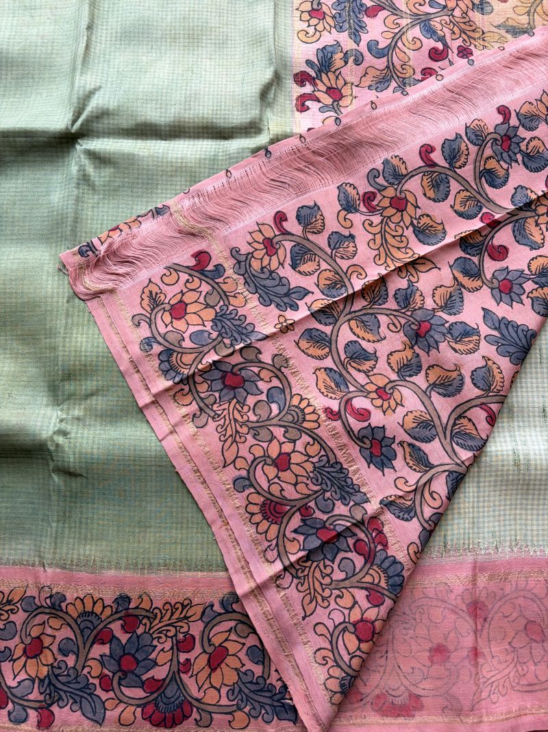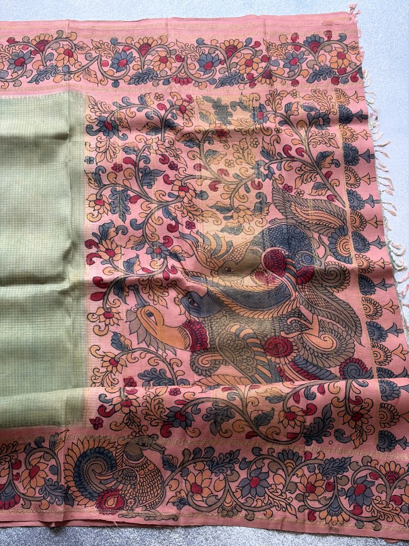 Pastel grace meets pure zari grandeur authentic Kalamkari breathes beauty into every inch of this Korvai Kanchipuram silk.