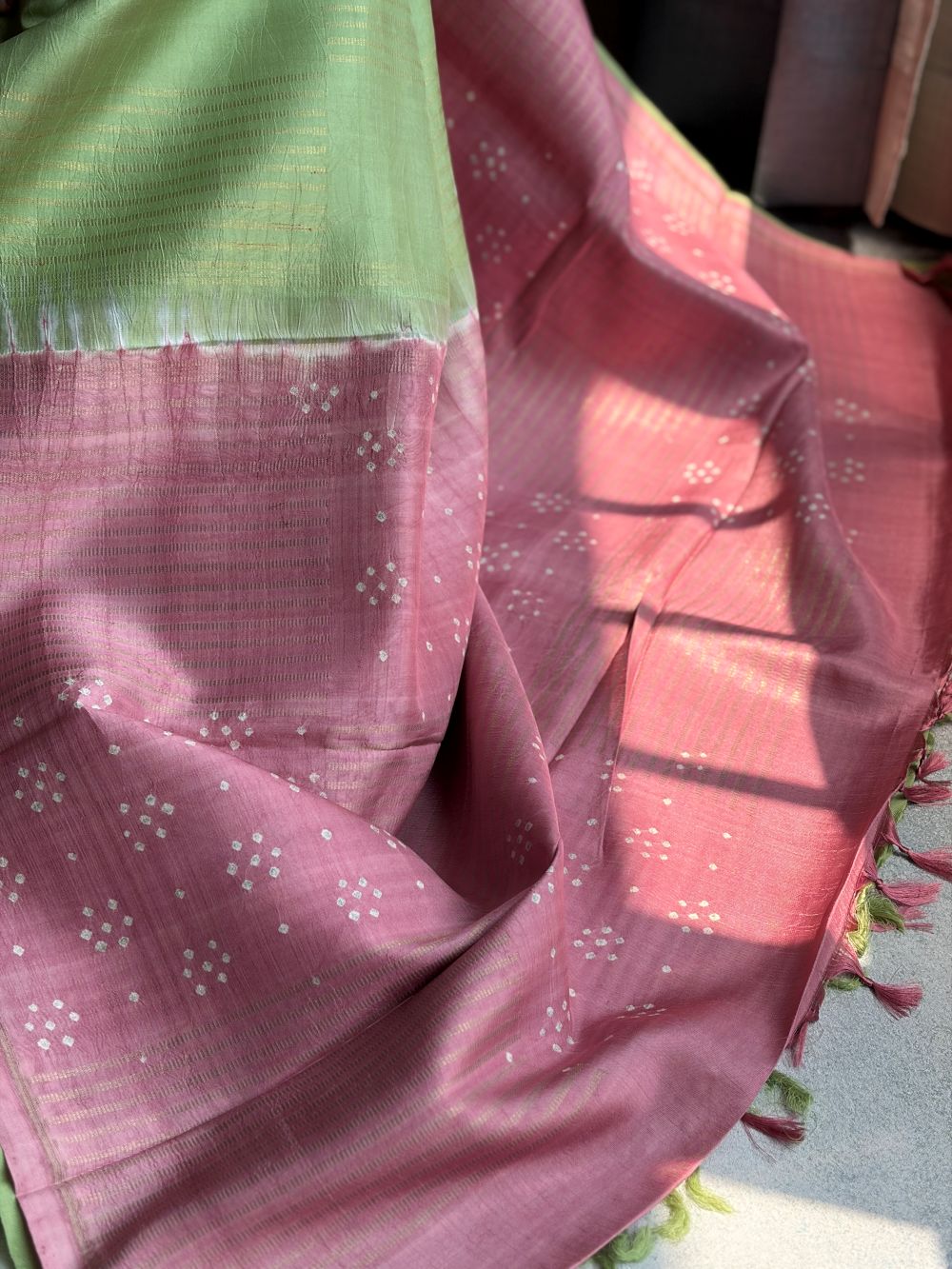 Pastel Green with Dusky Pink Hand-knotted Bandhani on Kanchipuram Silk