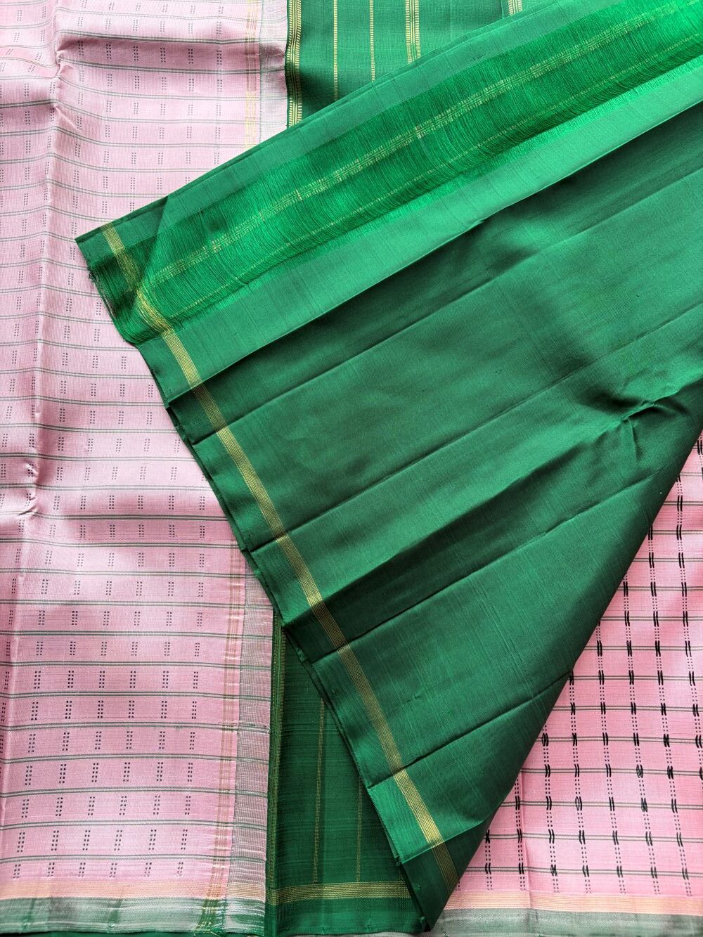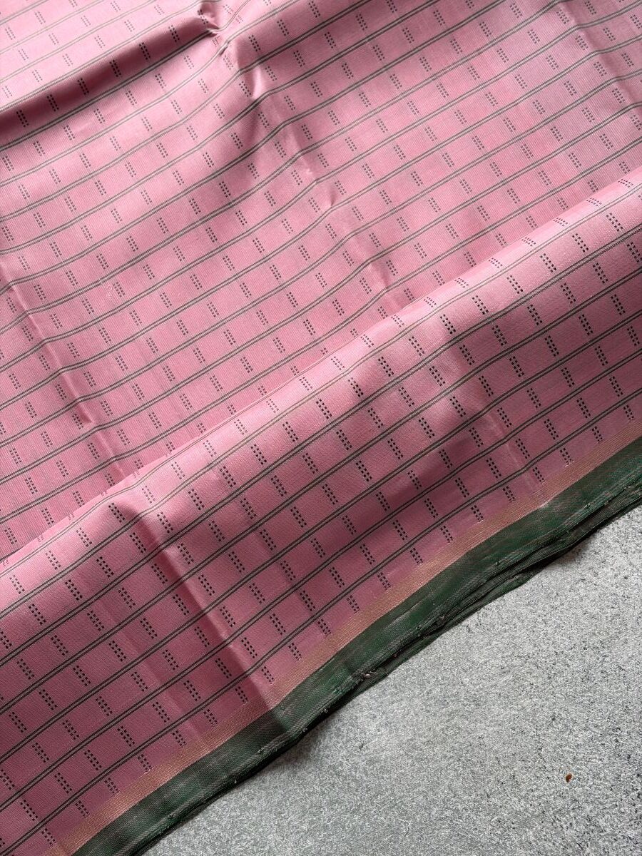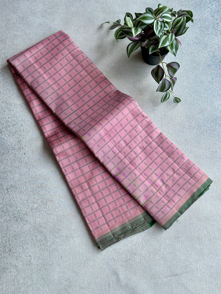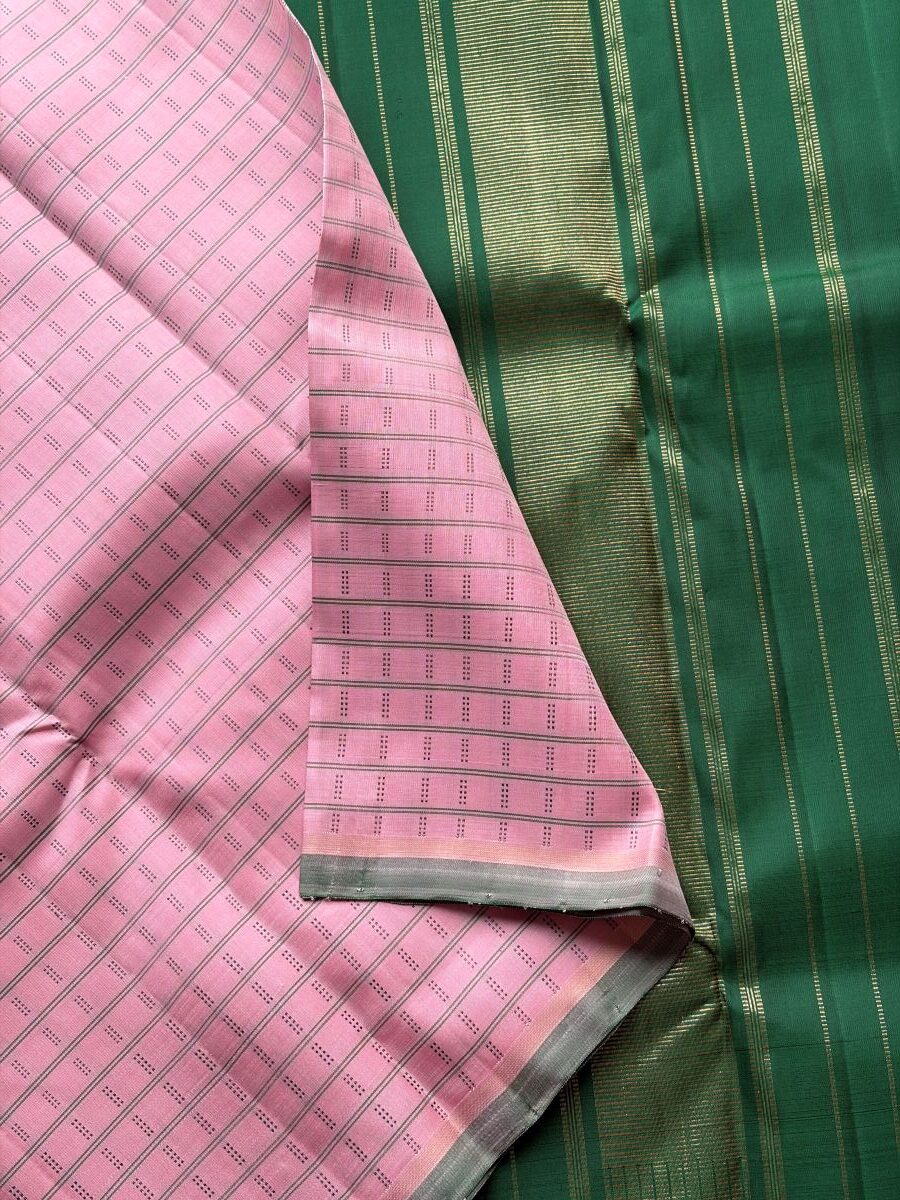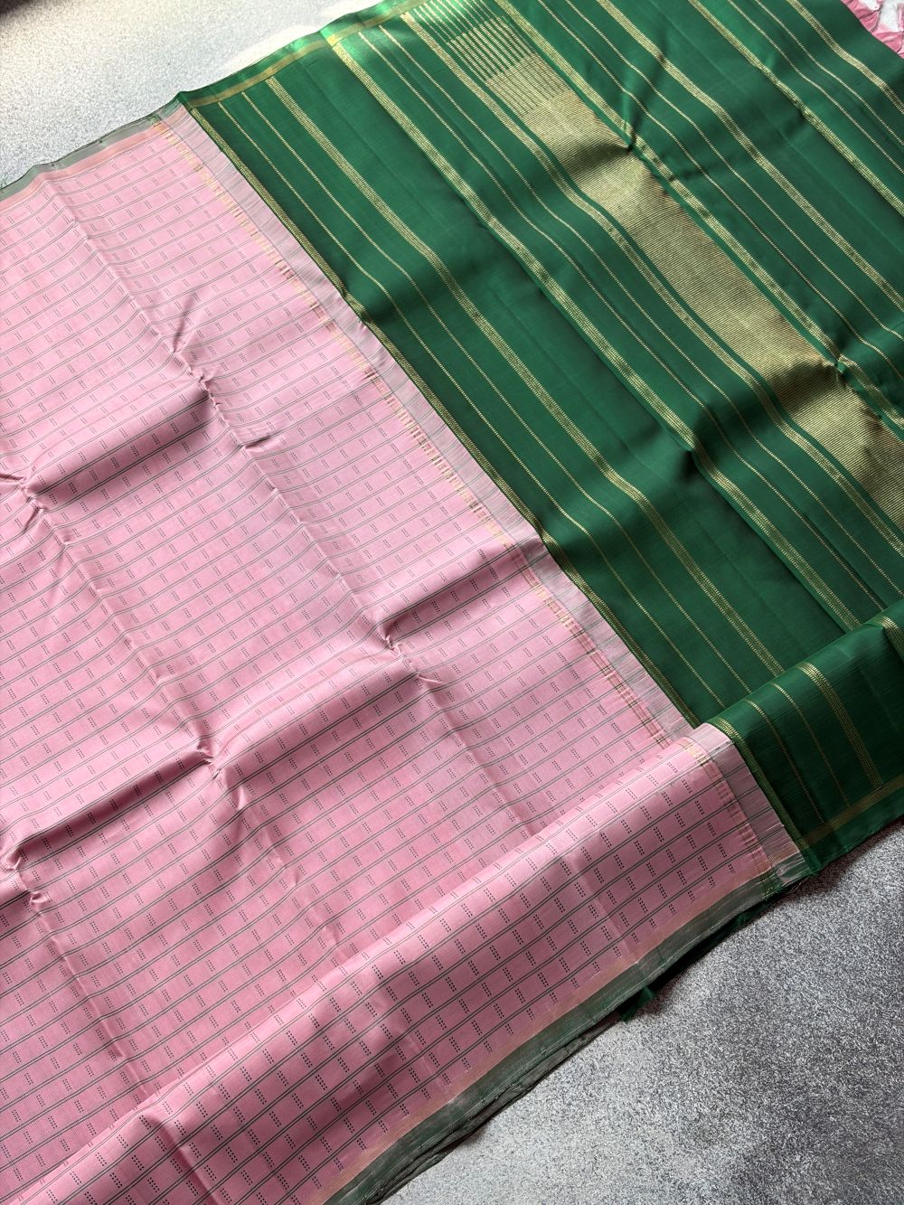 Pastel pink pure zari Kanchipuram silk saree with delicate thread work, green selvedge, green seer zari pallu and matching blouse.
