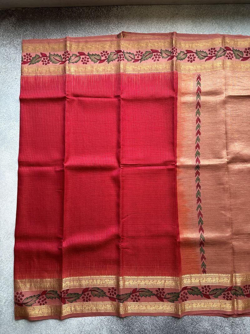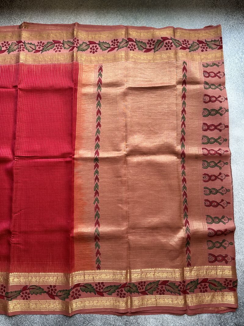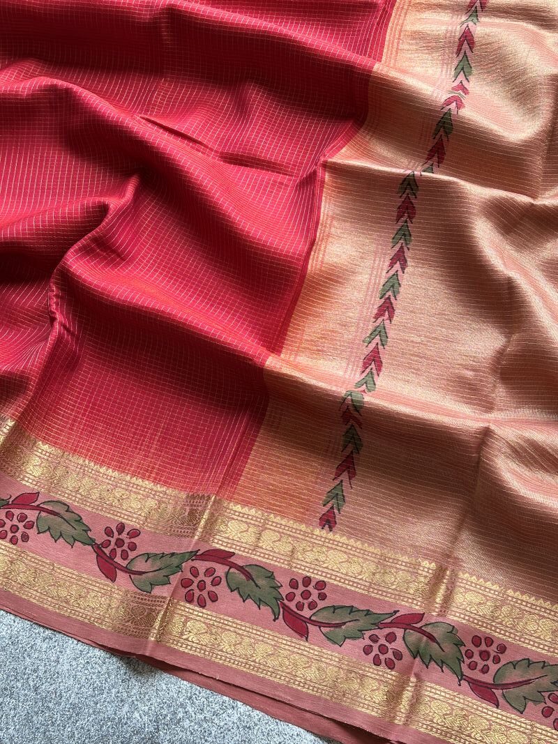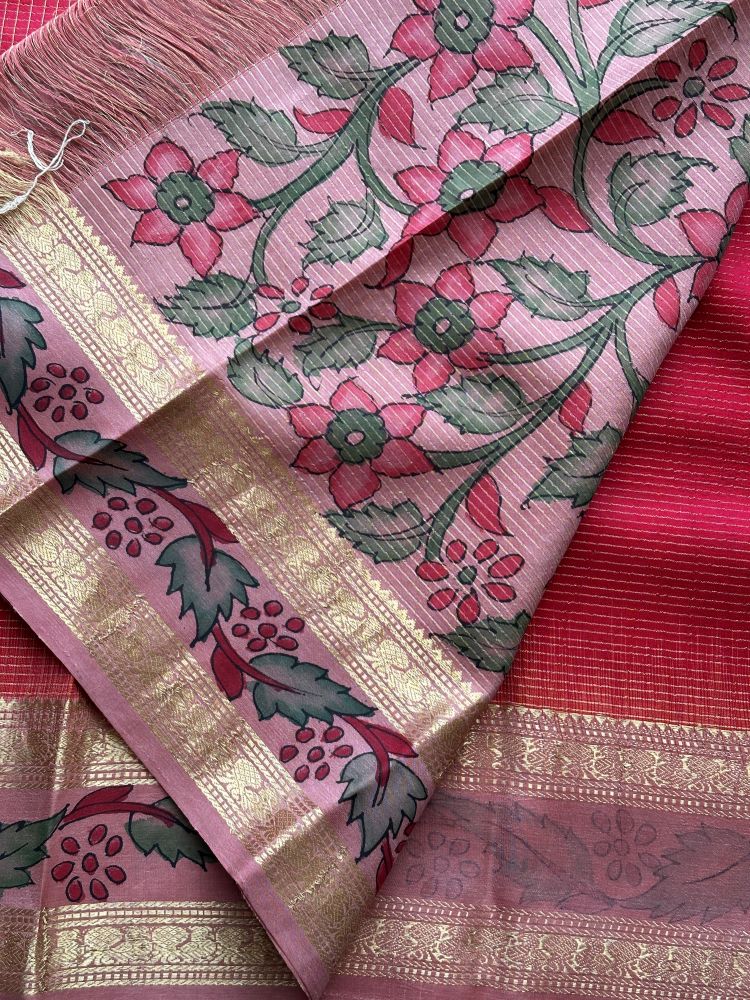 Radiate festive elegance in Pure Gadwal Silk, featuring zari checks, hand-drawn Pen Kalamkari on a pastel pink rettapet border, and a shimmering tissue zari pallu and blouse.